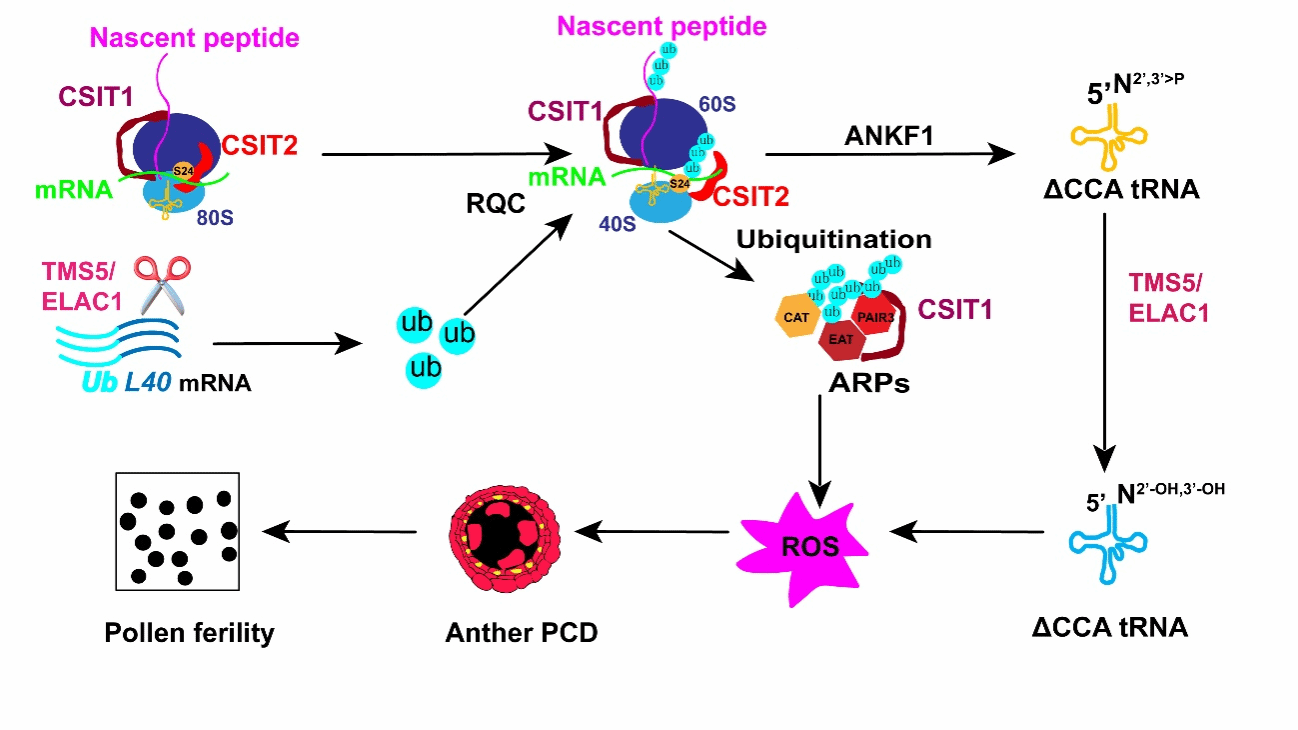 公司仲恺青年学者彭国清克隆了两个水稻温敏不育系的不育起点温度的基因CSIT1和CSIT2,这些基因突变会导致不育起点温度上升,杂交制种时不育系容易自交结实而导致制种失败(即两系制种不安全性)。CSIT1和CSIT2均编码E3泛素连接酶,与TMS5一起参与核糖体关联的蛋白质质量控制。CSIT1主要参与翻译错误蛋白或未正确折叠多肽的泛素化,而CSIT2在蛋白质翻译出错时泛素化核糖体蛋白使核糖体大小亚基解离。而核糖体解离后,参与翻译的tRNA也从核糖体解离下来,此时的tRNA的3'端存在缺陷,可能需要TMS5切去缺陷的3'端,重新加上CCA成为有活性的tRNA。