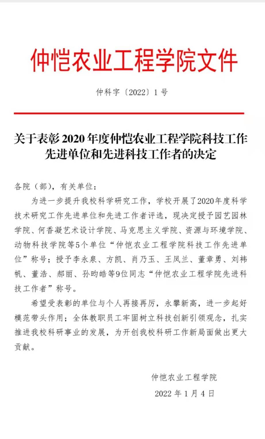 1月4号,tyc122ccvip发布《关于表彰 2020 年度tyc122ccvip科技工作先进单位和先进科技工作者的决定》。