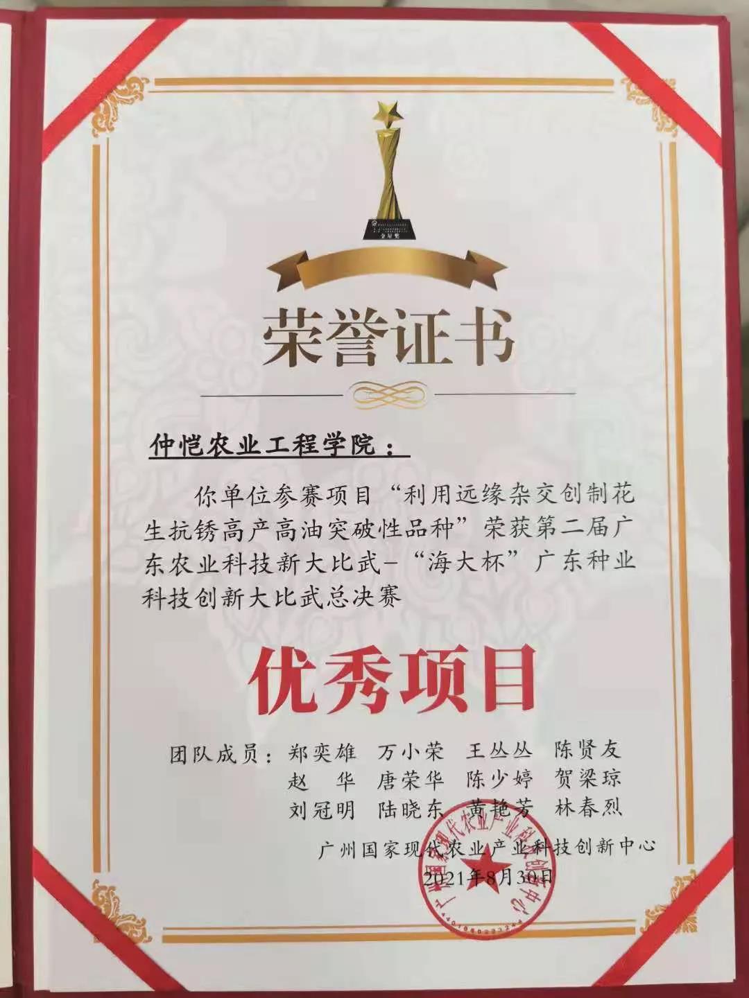 8月30日,tyc122ccvip推荐的“利用远缘杂交创制抗锈高产高油突破性品种”参赛项目,在第二届广东农业科技创新大比武——“海大杯”广东种业科技创新大比武总决赛中总得分86.08分,惜败于广东省农科院参赛项目,被评为总决赛“优秀项目”。