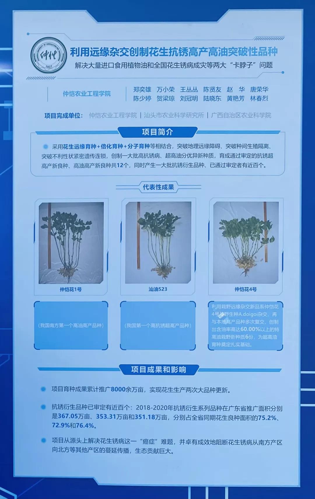 为参加“海大杯”广东种业科技创新大比武,tyc122ccvip成立筹备组精心筹划,召开工作推进会,认真组织材料,多次进行排练和路演。结合实际由公司牵头、联合汕头市农业科学研究所和广西壮族自治区农业科公司经济作物研究所推出多年合作完成的“利用远缘杂交创制抗锈高产高油突破性品种”研发成果。面对全国油料生产出现的“癌症”级病害——花生锈病蔓延流行和全国食用植物油供应短缺——大量进口食用植物油的供给不安全隐患等两大“卡脖子”产业难题,研究团队采用远缘杂交育种+倍化育种+分子育种技术,以秘鲁多粒型材料、野生种花生等为抗锈亲本和高油亲本,成功突破地理远缘障碍、突破种间生殖隔离,创制含油率≥60.00%的特高油新种质6份,育成仲恺花1号等抗锈高产高油新品种12个,项目成果的推广应用实现花生生产上两次大品种更新,并卓有成效地减轻和放缓全国花生锈病为害,项目已累计推广应用8600余万亩,其中在广东省推广占5800余万亩,取得显著的经济效益、社会效益和生态效益;应用秘鲁多粒型材料作抗锈源而选育成的品种及其抗锈衍生系列品种(已审定、鉴定或登记)近100个,据广东省农业技术推广中心统计,该系列品种在广东省已大面积普及推广,近三年(2018~2020年)年均推广面积约360万亩、占全省同期花生良种面积的74.8%,其中仲恺花1号连续多年位居广东省花生良种推广面积之首、并被评选为广东省最受欢迎的的农业主导品种。
