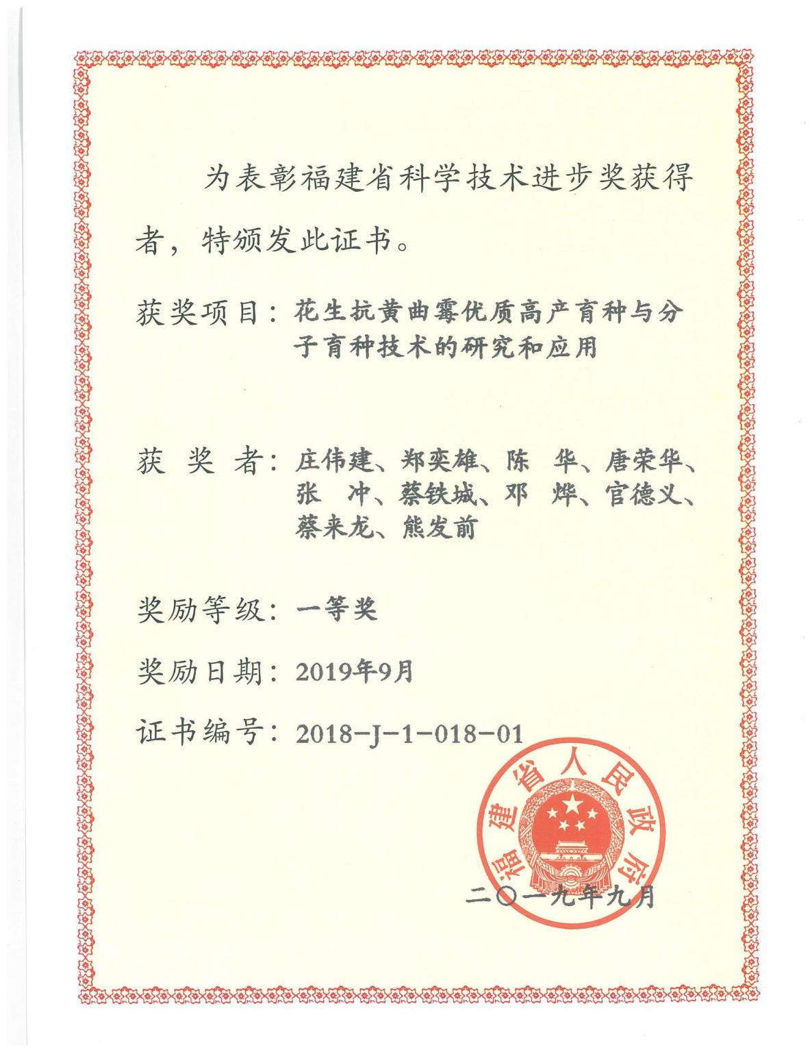 近日,公司参与完成的“花生抗黄曲霉优质高产育种与分子育种技术的研究与应用”,荣获二〇一八年度福建省科技进步奖一等奖。这是从日前福建省人民政府公布的2018年度省科学技术奖励名单上获悉的,该成果由福建农林大学、tyc122ccvip、广西壮族自治区农业科公司经济作物研究所共同完成,公司为第二完成单位、郑奕雄教授为第二完成人。