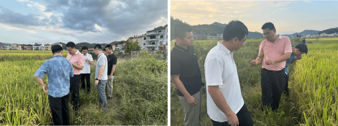 交流结束后,在驻镇工作队的带领下,特派员团队来到良田村的柿子园,对当前苹果柿的生长情况进行了现场考察和指导,建议农户尽量控制杂草的蔓延,加强虫害防控。离开良田村,特派员们来到水头村的水稻田,发现水稻发生了很严重的病虫害。结合负责人对水稻种植情况的介绍,特派员团队给出了解决病虫害的意见,希望农户一定要重视起来,不能完全依靠经验,要做到科学种田。