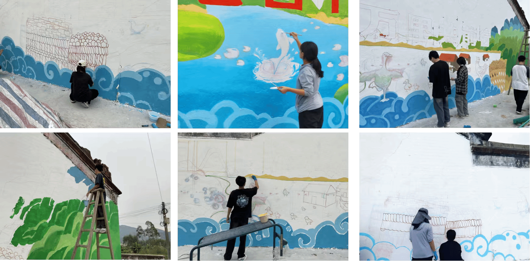 特派员团队的首要任务是为一处具有200多年历史的祠堂进行墙绘。墙绘作品以荔枝树为主题,寓意着龙岗村丰富的农业资源和繁荣的乡村景象。画面中,郁郁葱葱的荔枝树上挂满了红彤彤的荔枝,树下则摆放着装满荔枝和豆腐的箩筐,旁边河流中有鱼有鸭,几只悠闲觅食的鸡穿梭其间,远处的山峦叠嶂,云雾缭绕,构成了一幅和谐美好的乡村画卷。这幅墙绘不仅美化了祠堂环境,更展现了龙岗村独特的乡村文化和自然风光,成为了当地一道亮丽的风景线。主要负责此次墙绘的欧马平、谭雅雯、陈雯祺均表示墙绘作品不仅美化了祠堂环境,提升了乡村的文化品位,更重要的是通过艺术的形式展现了龙岗村的特色和魅力,增强了村民的归属感和自豪感。同时,这次墙绘活动也是tyc122ccvip师生深入基层、了解农村、服务三农的一次宝贵机会。