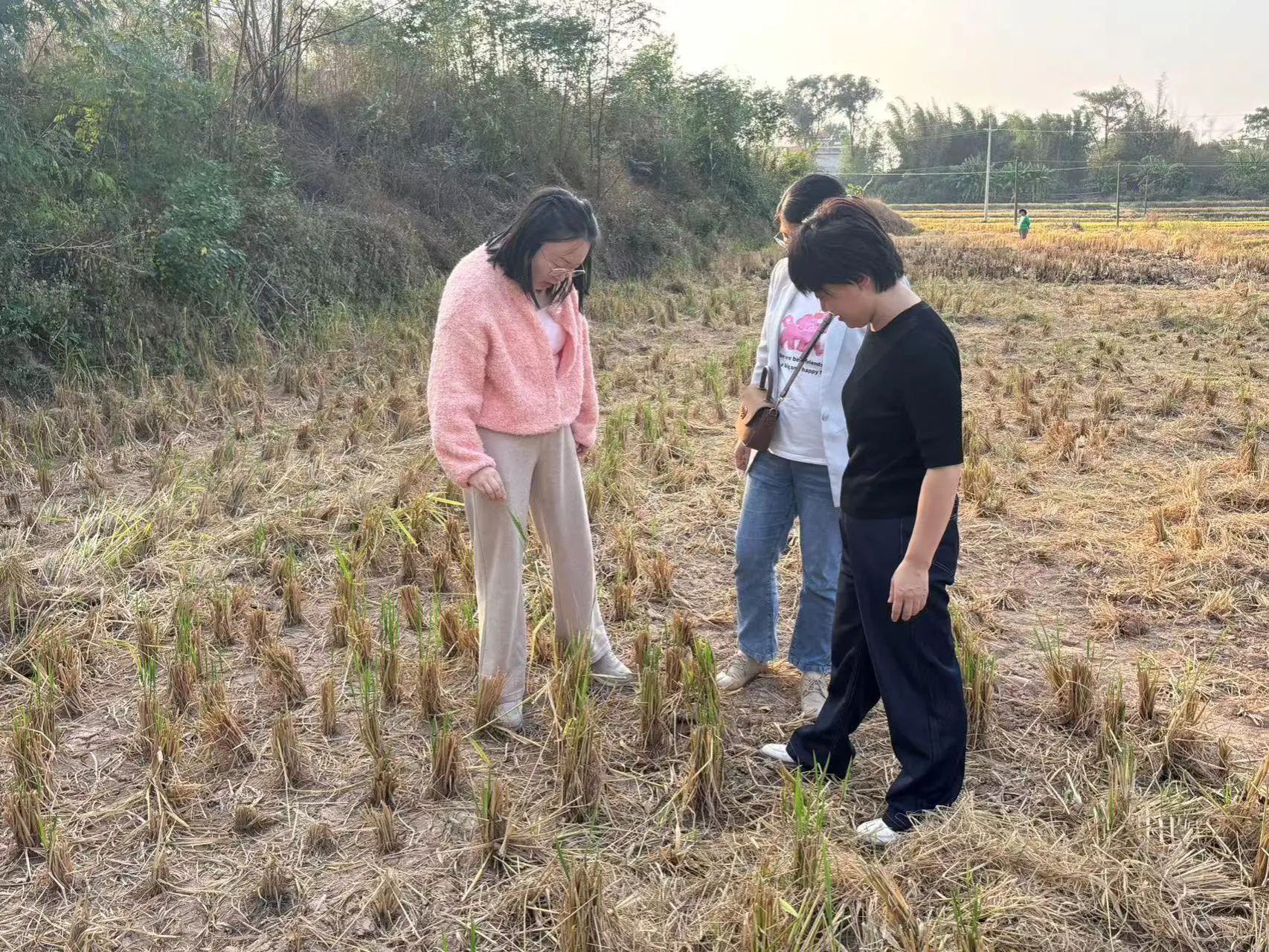 在调研最后,科技特派员团队深入田间,对水稻收获后的田地进行调查,发现当地在秸秆的处理采取的方法不当,包格根博士对秸秆处理不当带来的问题进行解答,对秸秆处理提供了科学的解决办法。对后续种植闲置时间可供种植的作物提供参考,为当地农民提供额外收入。也同时对明年主要经济作物烟草的种植,在前期的准备工作上,提供了明确的方法。