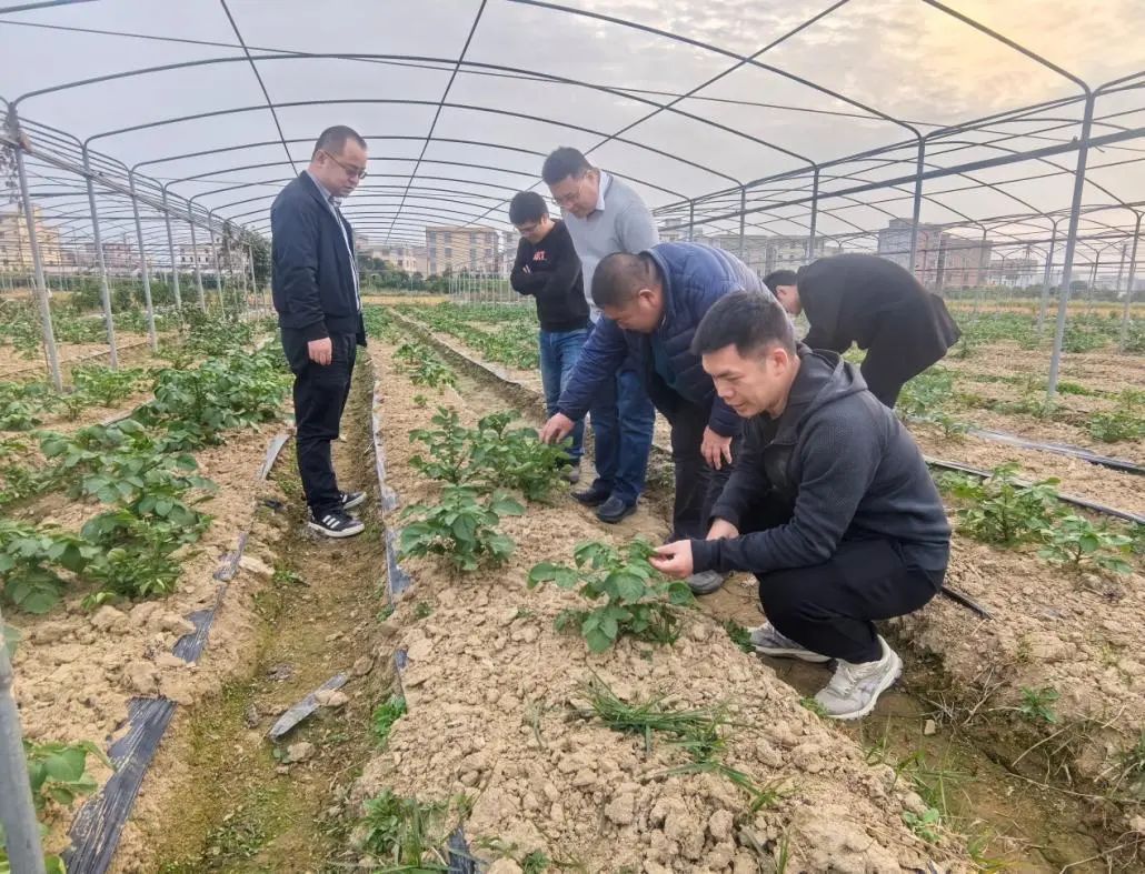 调研期间,科技特派员团队与驻镇帮镇扶村工作队一行到汕头市铂乐园种养有限公司考察交流,公司负责人张坤介绍了铂乐公司的甘薯、蔬菜、水稻等作物的种植、以及仓储的运维情况,并希望与特派员团队以及工作队在撂荒地整治、高标准农田建设、市场营销等领域开展合作,并结合新品种、新技术的引进示范,共同助力和美仙城的建设。在汕头市鑫雄种植有限公司,公司负责人周昭雄介绍了芥蓝、番茄、马铃薯等作物种养情况,近期受低温天气、干旱等因素的影响,蔬菜受病虫害的影响较大。陈青春表示,当前正值病虫害高发季节,要持续关注病虫害的发生指数,特别是鳞翅目幼虫的虫害情况,提前施策做好管护,并要结合冬季休田,做好农田深翻、晒田、以及作物轮作等事宜。此外建议有灌水条件的地方,尽可能开展水旱轮作,水资源不充足的情况下,可以考虑围田淹水灭虫、灭草,降低成本。