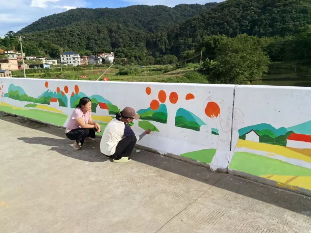梁书记介绍说,双头村主要农作物为沙糖桔,将桥上、墙上绘上沙糖桔、乡村美景,既可以改善双头村入口处的整体环境、美化乡村,又可以将该村的特色作物推广出去,推动当地经济发展。顶着炎热和烈日,在前晚描绘的基础上,团队成员开始调色、上色,每个同学负责一块区域,现场有条不紊,吸引了不少小孩驻足。很快,团队成员将硕大红透的沙糖桔和乡村美景搬上了桥侧,一幅幅生动精美的画面赫然跃入眼帘。隆街镇农办主任欧川美感叹顿觉眼前一亮,同时也感谢杨静美团队为隆街镇所做的工作。驻长沙村第一书记刘征见后大为赞赏,表示非常期望该团队能抽空到长沙村进行墙绘,做好长沙村的墙面美化和宣传工作。