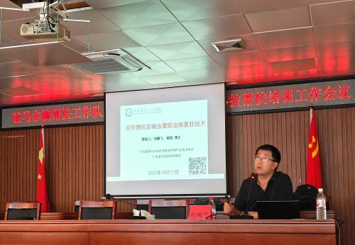 受台风“桦加沙”与“麦德姆”连续影响,阳江市阳春马水镇部分农田和果树出现倒伏及病虫害多发情况,农业生产面临严峻挑战。为助力灾后复产,提升农户灾后水稻和果树等的栽培管理和病虫害防控,tyc122ccvip农村科技特派员宋汉达团队迅速响应,特邀仲恺农生院刘鹏飞教授与园艺与园林公司涂攀峰副教授,于2025年10月17日赴马水镇开展专项技术培训与田间实地指导,聚焦水稻与番石榴两大主导产业,为农户送去关键技术支撑。