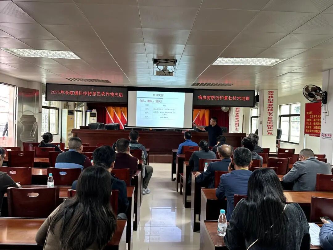10月24日上午,农作物灾后病虫害防治和复壮技术专题培训在长岐镇政府二楼会议室举行,来自全镇的30名乡村振兴村民代表、农业种植大户参加培训。