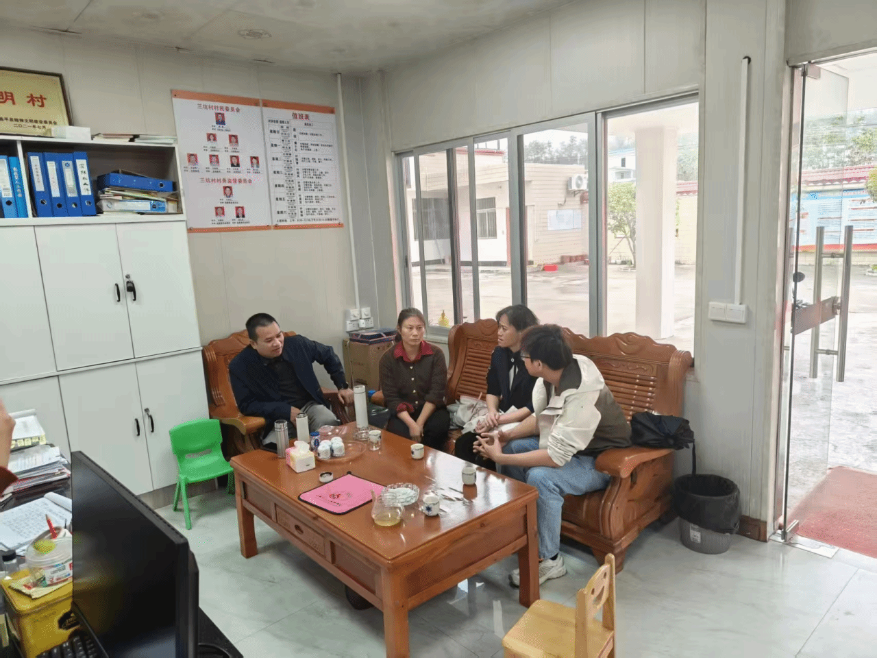 来到三坑村,杨静美团队和工作队队长杨梅、村支书周文、双头村驻村书记梁浩欣等商谈了三坑村作为典型村的后续发展工作。杨静美提出可以在该村绿化带、田园周边尝试种植紫云英、三叶草等,既能美化乡村容貌,又能将其作为绿肥,改善生态环境。杨梅队长对科技特派员提出的美化、增肥双重增效思路表示赞同,表示待气温高时可进行尝试。来到田间,红红的沙糖桔挂满枝头。杨静美仔细观察了当地的土质,表示土地肥力尚可,适合种植绿肥作物。但果园里的沙糖桔有些枝条黄的亮眼,杨静美告诉大家,这是典型的黄龙病症状,需要及时砍掉发黄感病的树枝,防止黄龙病蔓延。