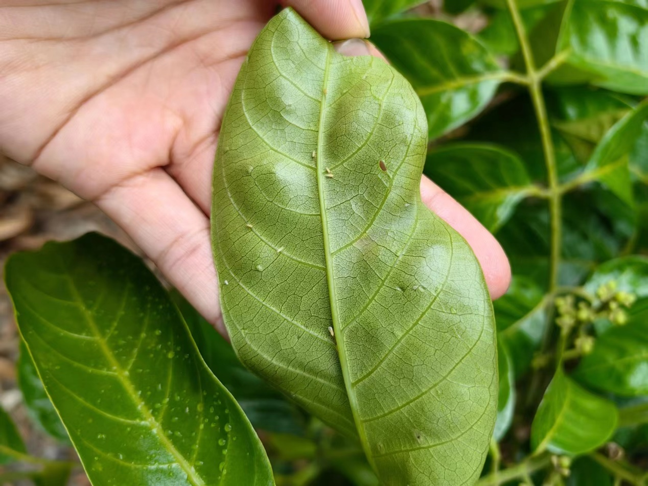 谷雨时节,当天阴雨绵绵,橄榄园春稍萌动,一片新绿,但同时活跃的还有橄榄天敌星室木虱。春稍是橄榄的关键结果枝之一,萌发的嫩叶和花芽正是多种害虫喜欢啃食的目标,李婵娟对农户强调,此时是一年中橄榄病虫害防控的关键时期,同时。