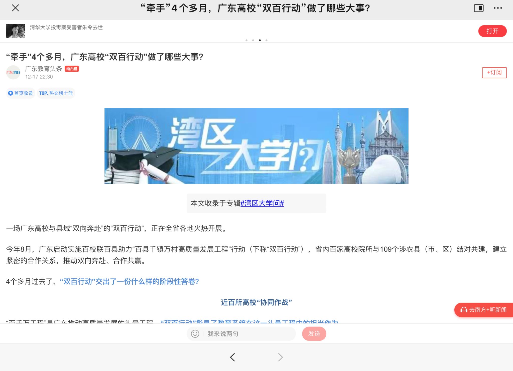 “百千万工程”是广东推动高质量发展的头号工程。“双百行动”彰显了教育系统在这一头号工程中的担当作为。