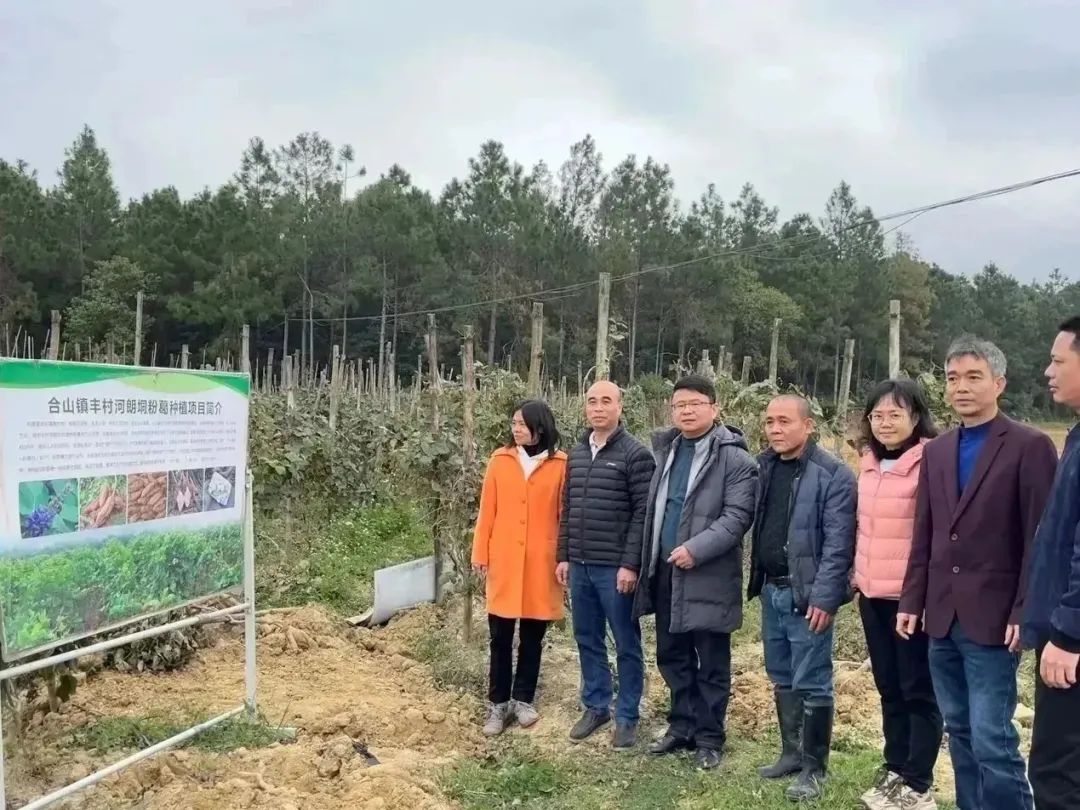随后,科技特派员及合山镇驻镇帮扶工作队一同前往合山镇丰村河朗垌粉葛种植基地了解粉葛种植情况,现场就粉葛种植过程中的问题提出改进意见,包括提高起垄高度、谨防灌水、注意病虫害防治等,建议改进采收技术以降低粉葛机械损伤,并指导农户正确保存及维护粉葛种质,为新一季粉葛种植的种植提供材料。
