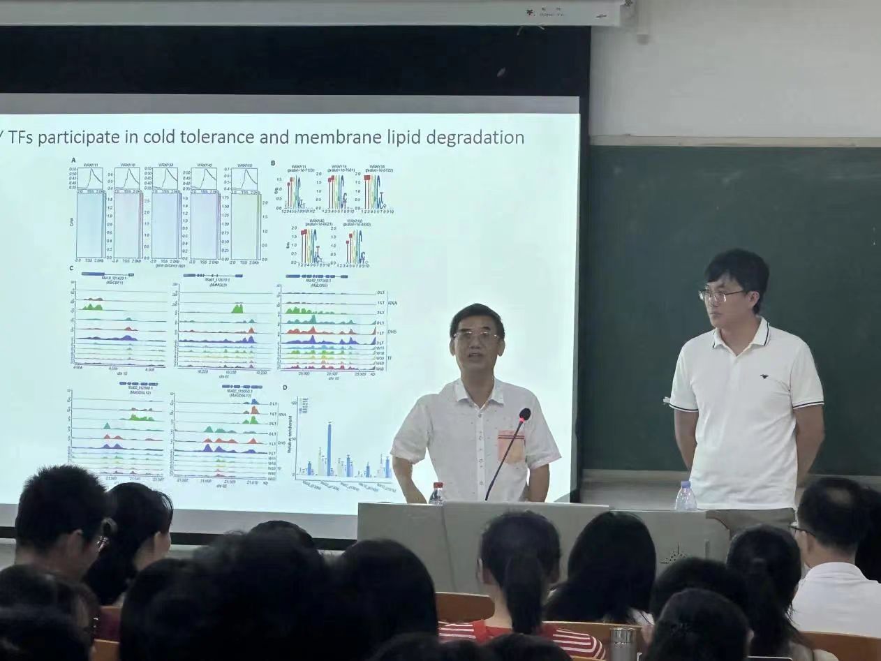 吕培涛的讲座围绕香蕉果实品质调控的前沿科学问题展开,凭借其深厚的学术底蕴和实践经验,将复杂的染色质修饰与果实品质调控机制讲解得通俗易懂。他详尽解析了如何通过识别染色质层面的非编码调控序列来探索香蕉品质改良的分子路径,分享的研究发现与独到见解令人耳目一新,极大地激发了在场师生的学术热情。互动环节中,面对教师们的提问,吕培涛展现出了极大的耐心与专业素养,逐一给予了详尽而深刻的解答。