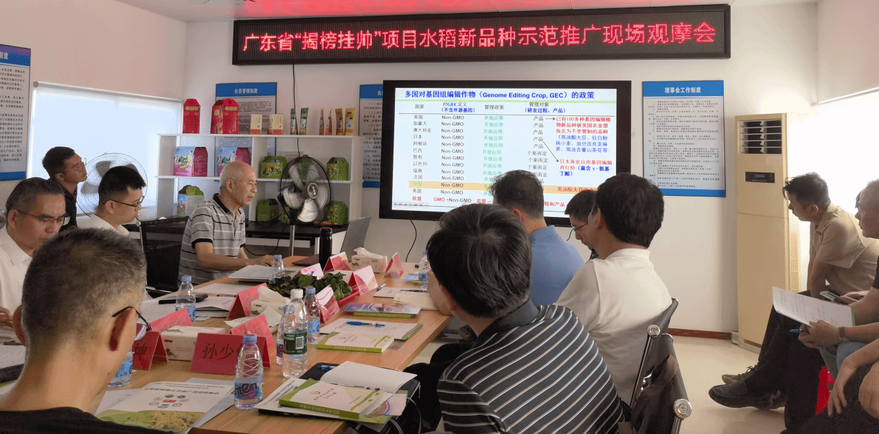 开幕式上,受揭阳市政府副市长刘鹏委托,揭阳市科学技术局林惠生局长致欢迎辞;省农业农村厅科教处副处长马金亮做总结讲话。刘耀光院士不仅领衔指导揭阳高端粮油种业示范基地建设,而且结合现场观摩活动的开展、不辞劳苦在田头会议室做了题为《从常规育种到生物技术育种》主旨学术报告。在总结讲话中,马金亮同志转达了省政府党组成员陈良贤、省农业农村厅厅长刘棕会等一行在10月30日到省“揭榜挂帅”项目揭阳粮油示范基地调研后,对这一专家云集、成果落地的“智力农场”典型模式的肯定与期许。马金亮对省市政事企各方的齐心协力、积极作为打造高端粮油种业示范基地表示感谢,高度赞扬揭阳高端粮油种业示范基地是省地链动深化合作的典型、是基础前沿与产业应用相结合的典型、是科企合作加速成果转化的典型;他表示,将坚决贯彻落实好刘棕会厅长的指示精神,认真总结、科学提练“智力农场”典型成功经验,形成可落地、可复制、可推广的省地链动和科企合作新模式。