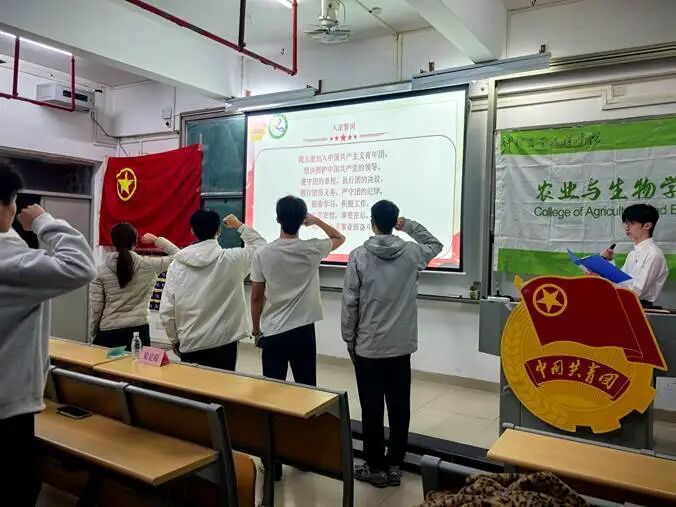 “我志愿加入中国共产主义青年团,坚决拥护中国共产党的领导……”在梁定超的带领下,全体新团员起立,右手握拳高举过肩,庄严宣誓。铿锵有力的誓言响彻全场,字字千钧,既是对共青团组织的郑重承诺,也是对青春理想的深情告白,展现了新时代农生青年矢志不渝跟党走的决心。