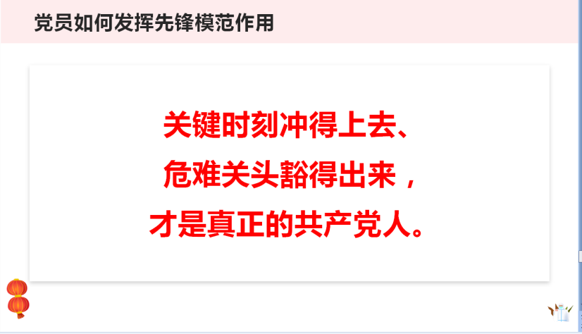 “疫”线党课,让防疫期间的党员活动鲜活起来。以先锋之号召,强责任之担当,显党员之本色,让党员们在学习交流中凝心聚力,提升战“疫”战斗力。让党徽在特殊时期闪闪发光!