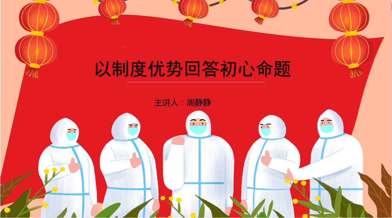 课上,周静静以《制度优势回答初心使命》为题,首先带领大家重温了习近平总书记《在统筹推进新冠肺炎疫情防控和经济社会发展工作部署会议上的讲话》精神,回顾了我国新冠肺炎疫情防控历程,通过生动的视频展现了各行各业党员干部积极投入抗疫的事迹,并从“有了核心就有了定海神针、全民动员盘活中国力量、舆论引导强信心聚民心这三个方面阐述了我国制度优势在本次战疫过程中的具象化呈现,并通过与他国抗疫的对比,指出战“疫”中的中国共产党人用实际行动精准回答了“初心”命题,本次战疫历程中真正是以人民价值为主体,回答了“为了谁”。以人民为实践主体,回答了依靠谁的问题。