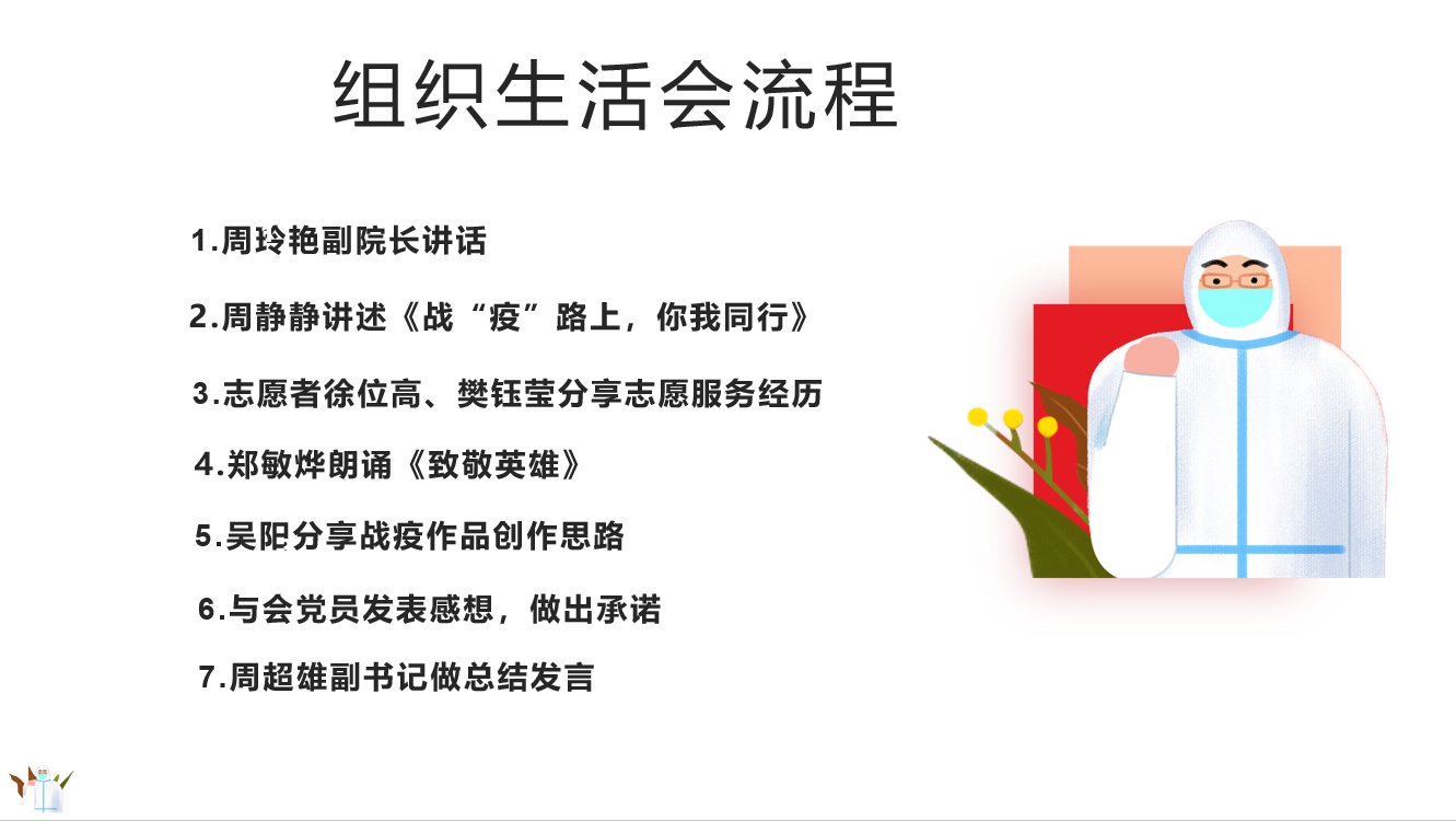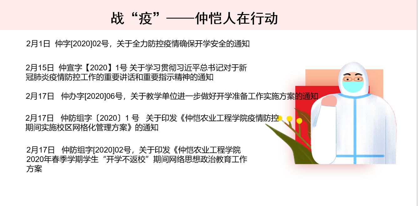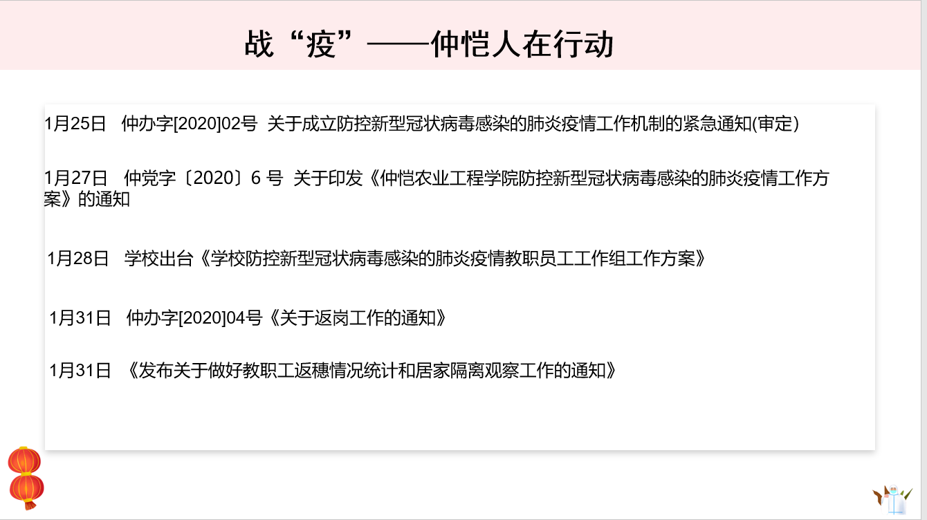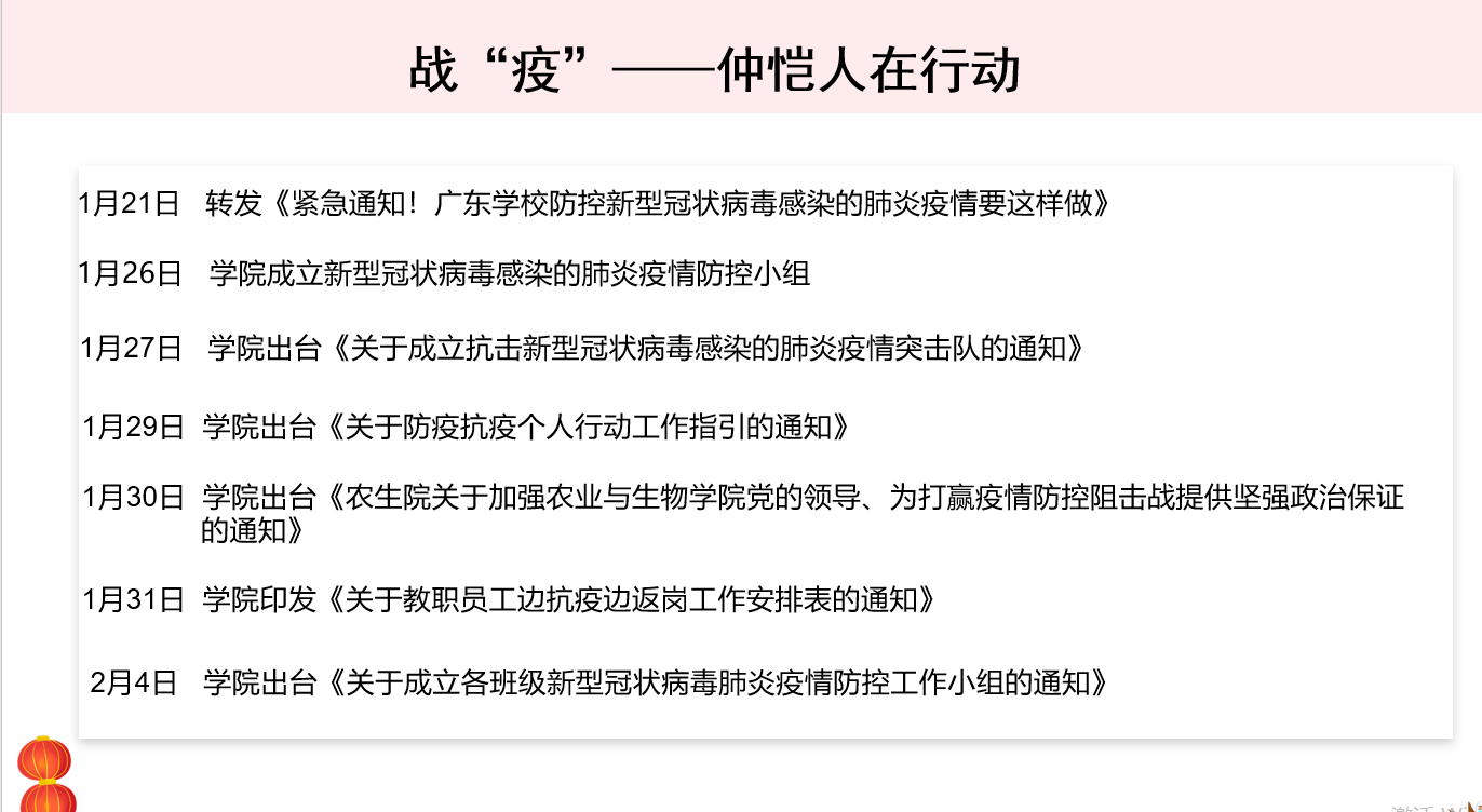 接着,周静静做了“战‘疫’路上,你我同行”的分享,她以7次中央政治局常委会的议题和习近平总书记每次会议上的关键词为主线,带领大家回顾了习近平总书记亲自指挥部署这场疫情防控阻击战的全过程,并从八个方面梳理出中国的抗疫方案。接下来,她以“战疫,仲恺人在行动”为主题,向大家简要介绍了公司层面和公司层面在本次战疫过程中出台的多项文件精神,展示了仲恺人、农生人面对疫情的迅速响应能力和高效的执行力。