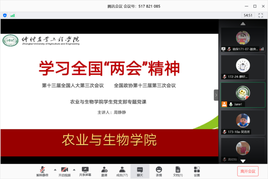 接着,周静静对两会十大民生热点作了详细的解读,并带领大家学习了全国两会精神及中央领导“两会”期间讲话精神。她特别提到,在看望参加政协会议的经济界委员时,总书记强调做好“六稳”工作、落实“六保”任务,以人民情怀筑牢民生幸福根基;在内蒙古代表团,总书记着眼中华民族长远发展,明确要“牢固树立生态优先、绿色发展的导向”,倡导“留与子孙后代”的发展理念,保持加强生态文明建设的战略定力;总书记还专门来到湖北代表团,礼赞抗疫奉献者,深刻阐释如何践行人民至上;在解放军和武警部队代表团,习主席作出“坚持底线思维,全面加强练兵备战工作”“探索常态化疫情防控条件下练兵备战方式方法”等一系列重要指示,凝聚起强国兴军的磅礴力量。她强调,在座的员工党员一定要认真学习领悟两会精神,将学习两会精神的政治热情转化为学习研究和创新创业的实质动力。此外,她还对积极参与“三支一扶”和西部计划的毕业生党员给予了表扬,肯定了他们不畏困难、挺难而上的新时代青年担当和奉献精神,并鼓励其余的员工党员们努力学习,发挥好先锋模范作用,引领好学风和院风,毕业后积极创新创业,扎根基层,为国家的乡村振兴战略做出突出的贡献。