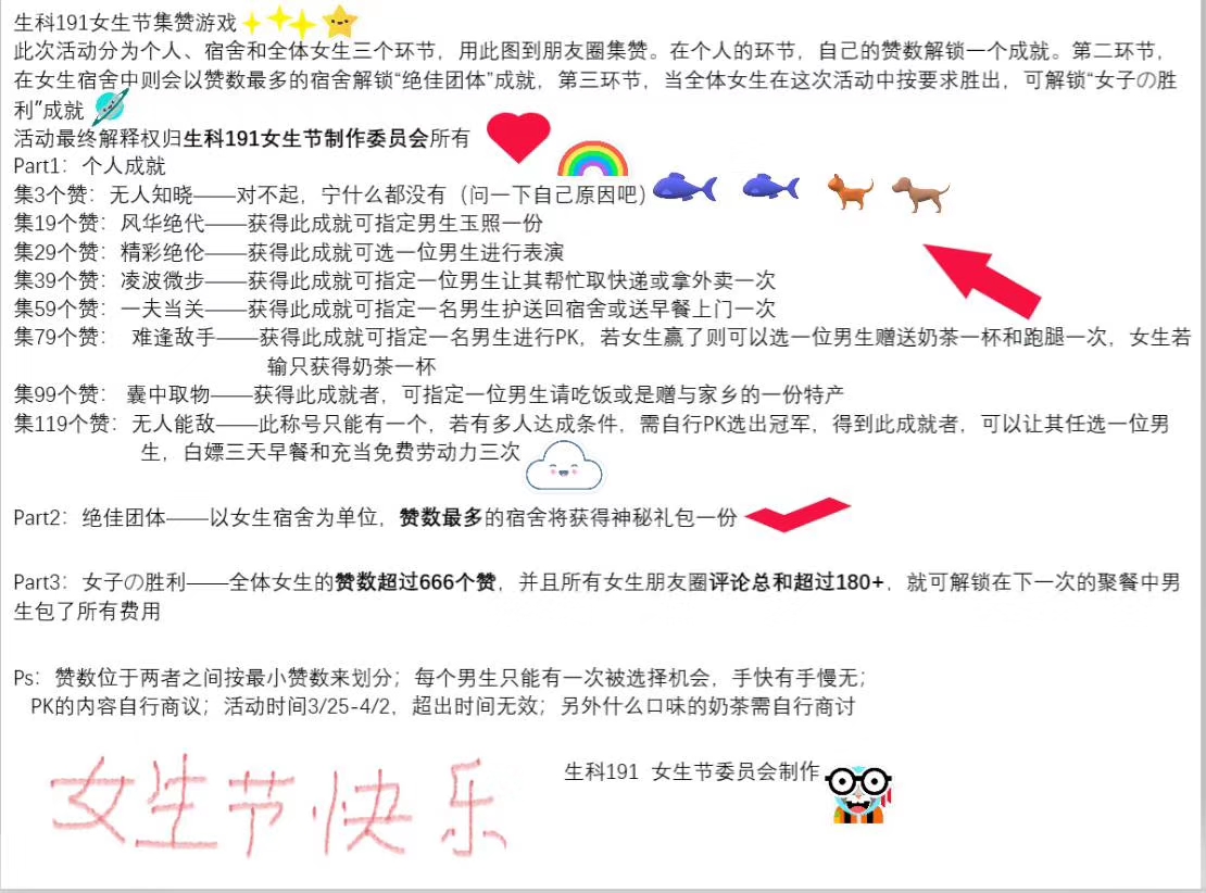 因为疫情,我们的第一次女生节只能推迟了,班上的大猪蹄子们对我们女生还算是有心意的,在一号当天给我们发红包,3月末女生们发朋友圈求集赞来换相应的。