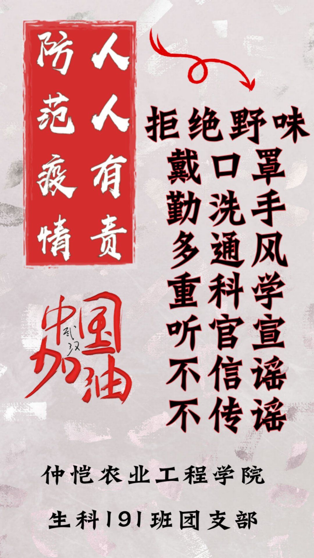 2020年注定是不平凡的一年,面对疫情的爆发,我们尽量做到不信谣不传谣,待在家里听从党的指挥等待公司的指示,停学不停课在家也好好学习。班长为我们班团支部做了一张海报,团支书鼓励大家一起发朋友圈警示身边的家人朋友们,为对抗疫情尽一份微薄之力。