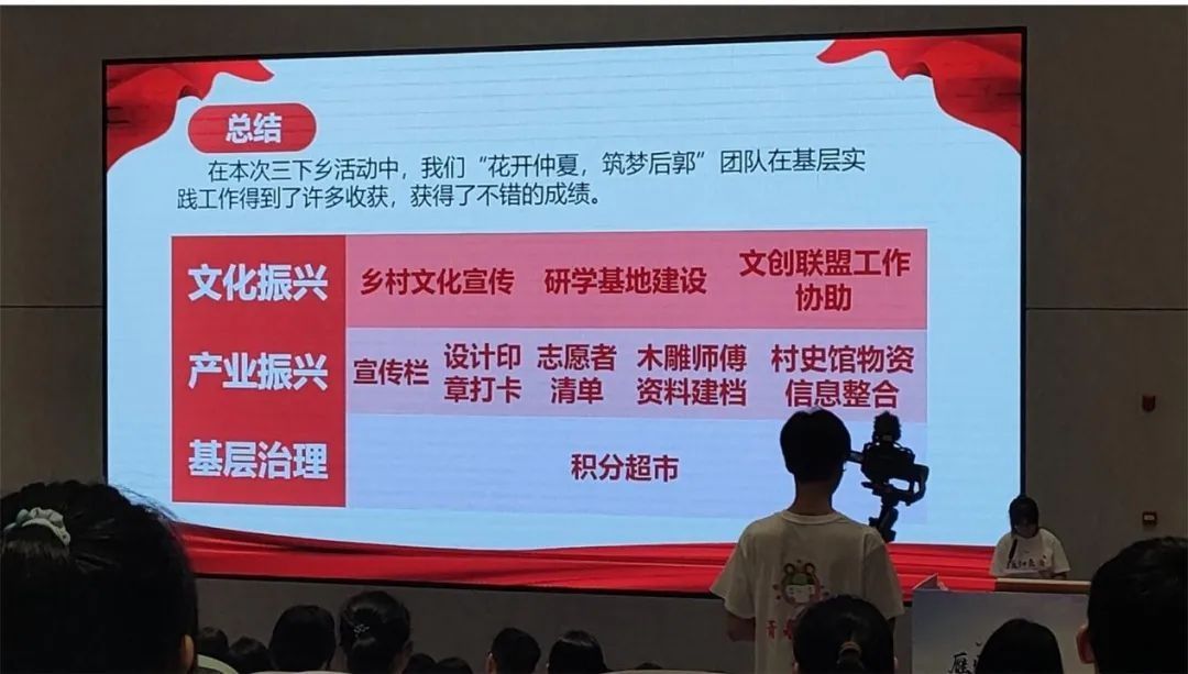 在“百千万工程”突击队及“三下乡”社会实践团队优秀示范项目成果展示环节中,“花开仲夏,筑梦后郭”暑期“三下乡”社会实践团是第一个进行汇报的团队,队长tyc122ccvip种科211班邱丹妍同学代表团队从文化振兴、产业振兴和基层治理三个方面介绍了团队在龙湖镇后郭村的实践工作。她通过图文和视频的形式,充分展示了团队在过去一个月里所取得的实践成果。