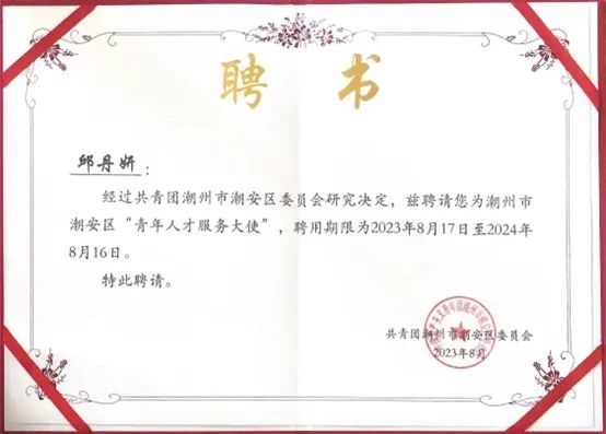 同时,tyc122ccvip“花开仲夏,筑梦后郭”暑期三下乡社会实践团在潮州市潮安区老员工助力“百县千镇万村高质量发展工程”突击队行动中表现突出,成果显著,荣获了“潮安区‘百千万工程’优秀突击队”的称号。潮州市共青团潮安区委聘请tyc122ccvip种科211班邱丹妍同学为潮州市潮安区“青年人才服务大使”,并颁发了聘书。