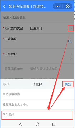 根据与签约单位约定户口、档案的去向进行填写。如未确定或需申请接收函件,“档案去向类型”一律先选择“回生源地”,其他项目暂不填报。