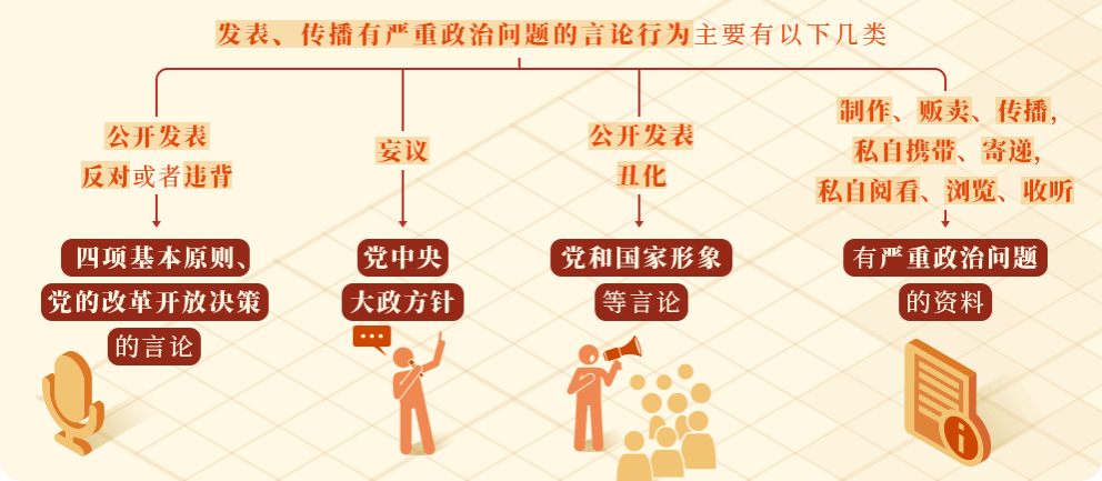 《中国共产党纪律处分条例》第五十条、第五十一条、第五十二条对发表、传播有严重政治问题的言论行为列出负面清单,目的是严格规范党员言论,以严格的纪律处分规定保障四项基本原则、改革开放决策、党中央大政方针贯彻落实,维护党和国家形象,维护党和国家领导人威信,维护英雄模范形象,坚决反对歪曲党的历史、中华人民共和国历史、人民军队历史的行为,维护党的团结和统一。发表、传播有严重政治问题的言论行为主要有以下几类:
