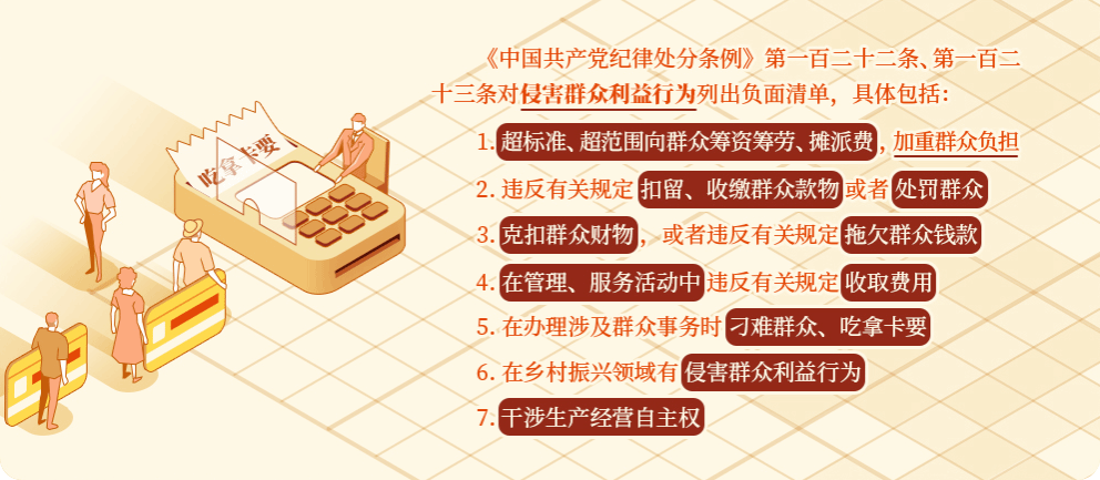 《中国共产党纪律处分条例》第一百二十二条、第一百二十三条对侵害群众利益行为列出负面清单,作出处分规定。这些问题的实质是党员不能正确对待手中的权力,把公共权力异化为管理者的私权,严重损害党和政府的形象,损害党群、干群关系,必须予以禁止。