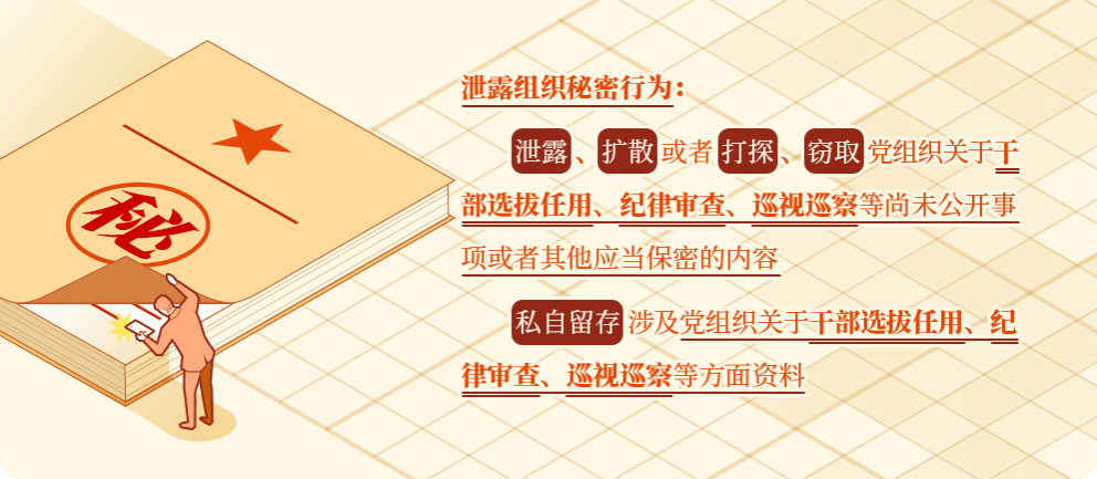 “严守党的纪律,保守党的秘密”,是每名党员入党宣誓时的郑重承诺。无论选人用人工作、纪律审查工作,还是巡视巡察等工作,都有严格的保密纪律。《党政领导干部选拔任用工作条例》规定,选拔任用党政领导干部,不准私自泄露研判、动议、民主推荐、民主测评、考察、酝酿、讨论决定干部等有关情况。《中国共产党纪律检查机关监督执纪工作规则》规定,监督执纪人员不准私自留存问题线索和涉案资料,严禁泄露审查调查工作情况,对纪检干部私存线索、跑风漏气、违反安全保密规定等违纪行为要严肃处理。《中国共产党巡视工作条例》规定,巡视工作人员私自留存巡视工作资料,泄露与巡视工作有关的未公开信息的,要给予处理处分。党员干部必须充分认识保守党的秘密的极端重要性和自身肩负的保密责任,对组织尚未公开的事项守口如瓶,自觉筑牢保密防线。