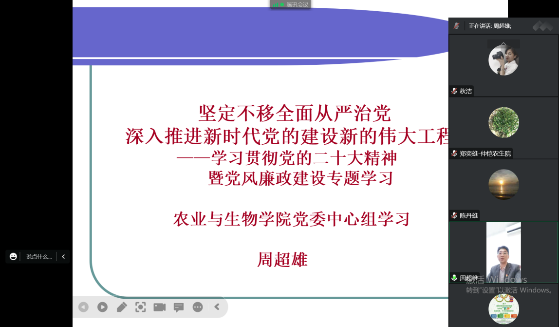 为进一步推进全面从严治党向纵深发展,12月2日晚,农业与生物公司党委召开理论中心组学习暨党风廉政建设专题学习会,并围绕“学习贯彻党的二十大精神全面从严治党”进行研讨交流。会议由公司党委书记陈丹雄主持,党委副书记周超雄主讲,公司党委理论学习中心组全体成员参加学习。