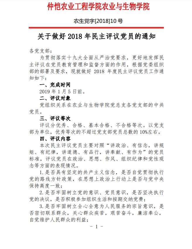 农生党字〔2018〕10 号-关于做好2018年民主评议党员的通知
