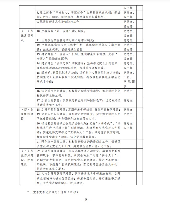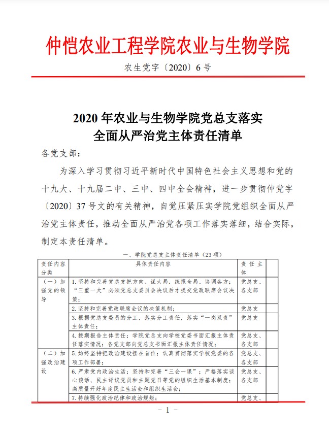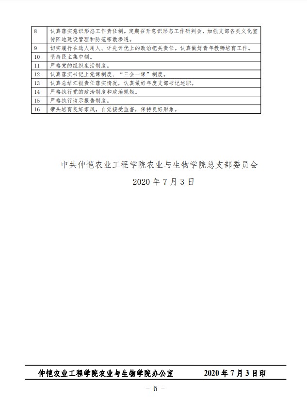 农生党字〔2020〕6 号-2020年农业与生物公司党总支落实全面从严治党主体责任清单