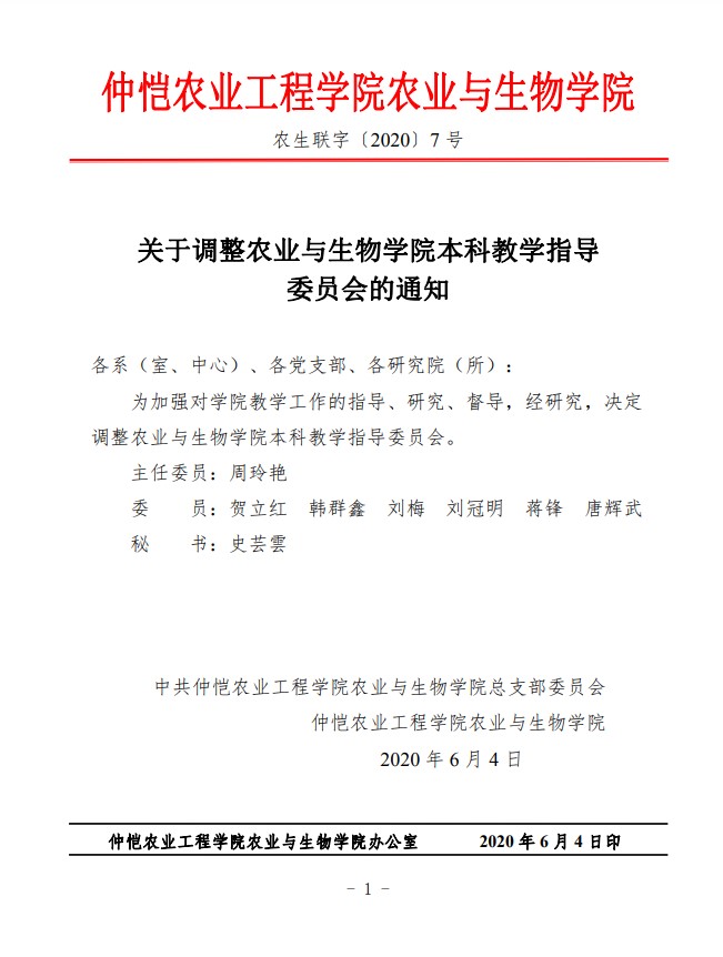 农生联字〔2020〕7号-关于调整tyc122ccvip本科教学指导委员会的通知