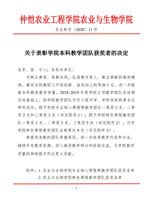 农生联字〔2020〕11号-关于表彰公司教学团队获奖者的决定
