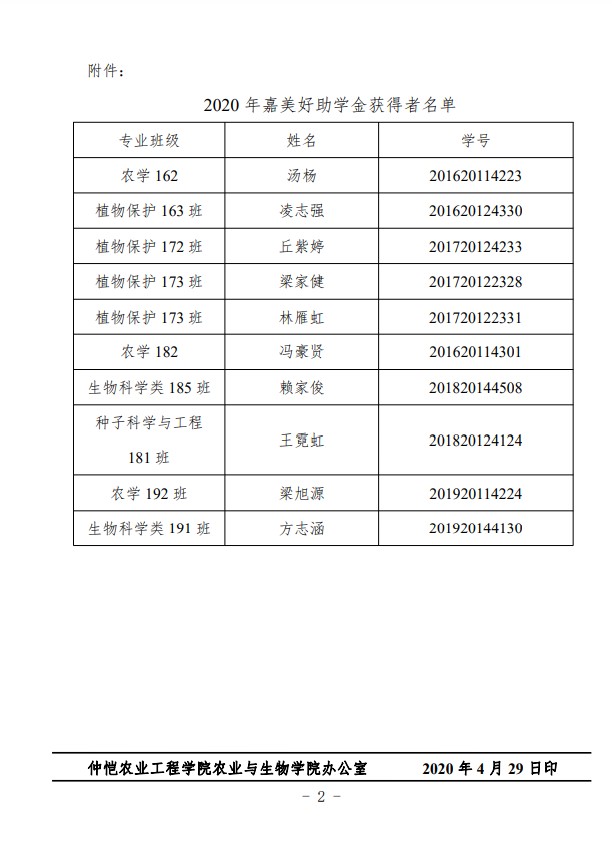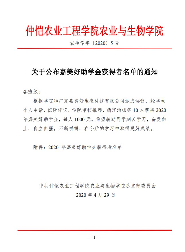 农生学字〔2020〕5号-关于公布嘉美好助学金获得者名单的通知