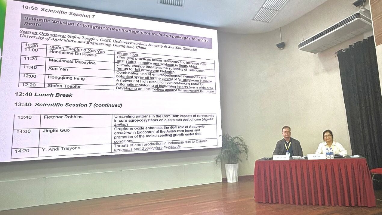 本次会议设8个报告专场和海报展示环节。在报告专场中,颜珣研究员与来自瑞士CABI的Stefan Toepfer博士共同组织了“玉米害虫综合防治工具及配套措施”(Integrated pest management tools and packages for maize pests)专题研讨会,邀请了来自南非、博茨瓦纳、中国、瑞士、美国、印度尼西亚和马来西亚的9位学者,就玉米害虫综合防控的最新进展做了系统报告。