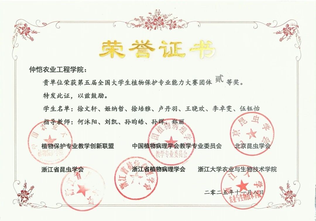 11月7日-9日,tyc122ccvip何沐阳、刘凯、孙昀皓、邵明伟、韩群鑫、郑丽等教师带队员工参加第五届全国老员工植物保护专业能力大赛并取得了优异的成绩,荣获团体二等奖等多项荣誉。