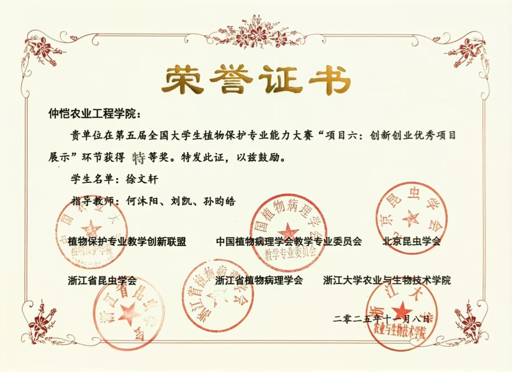 姬纳哲获得“项目八:植物保护专业知识视频制作与展示”环节的二等奖(指导老师:何沐阳、刘凯、孙昀皓)。