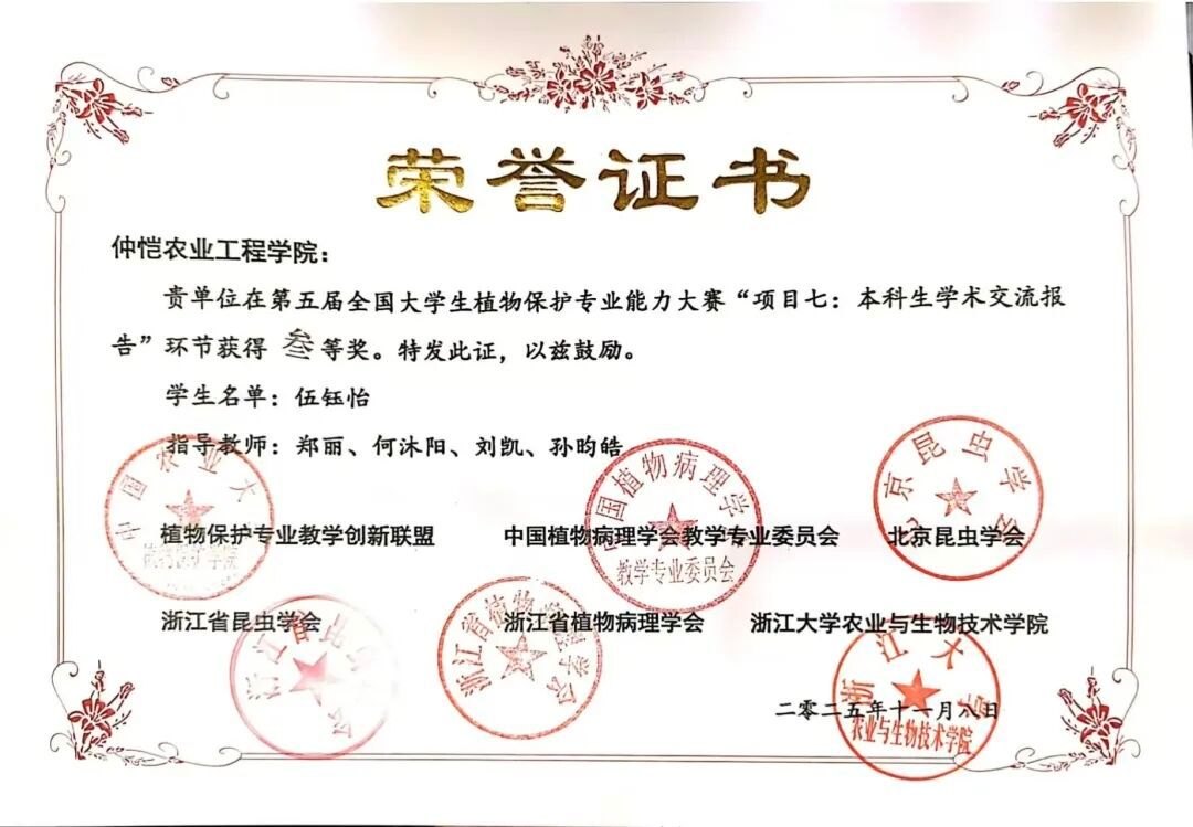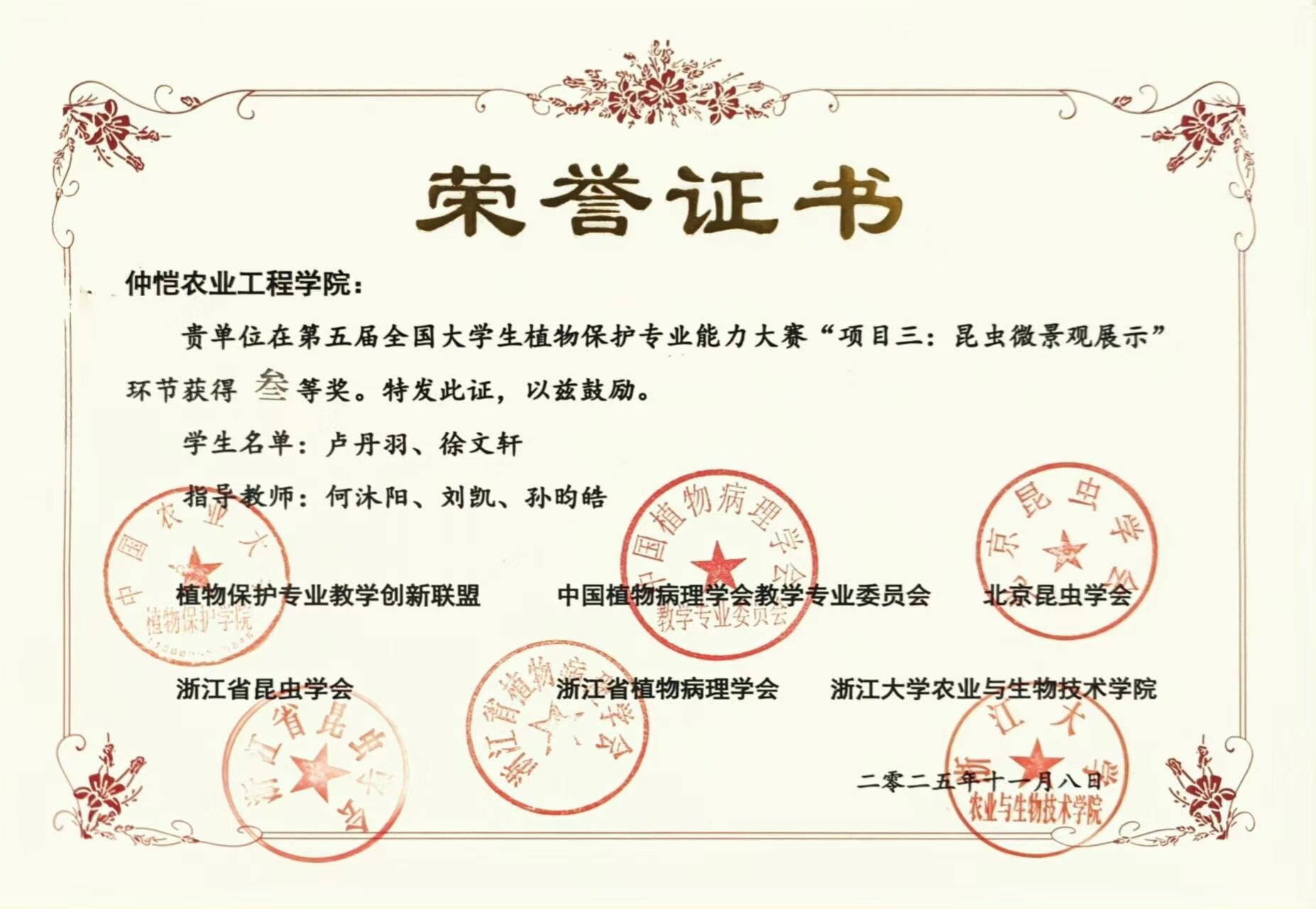 姬纳哲获得“项目九:植物保护专业知识动画制作与展示”环节的三等奖(指导老师:刘凯、何沐阳、孙昀皓)。