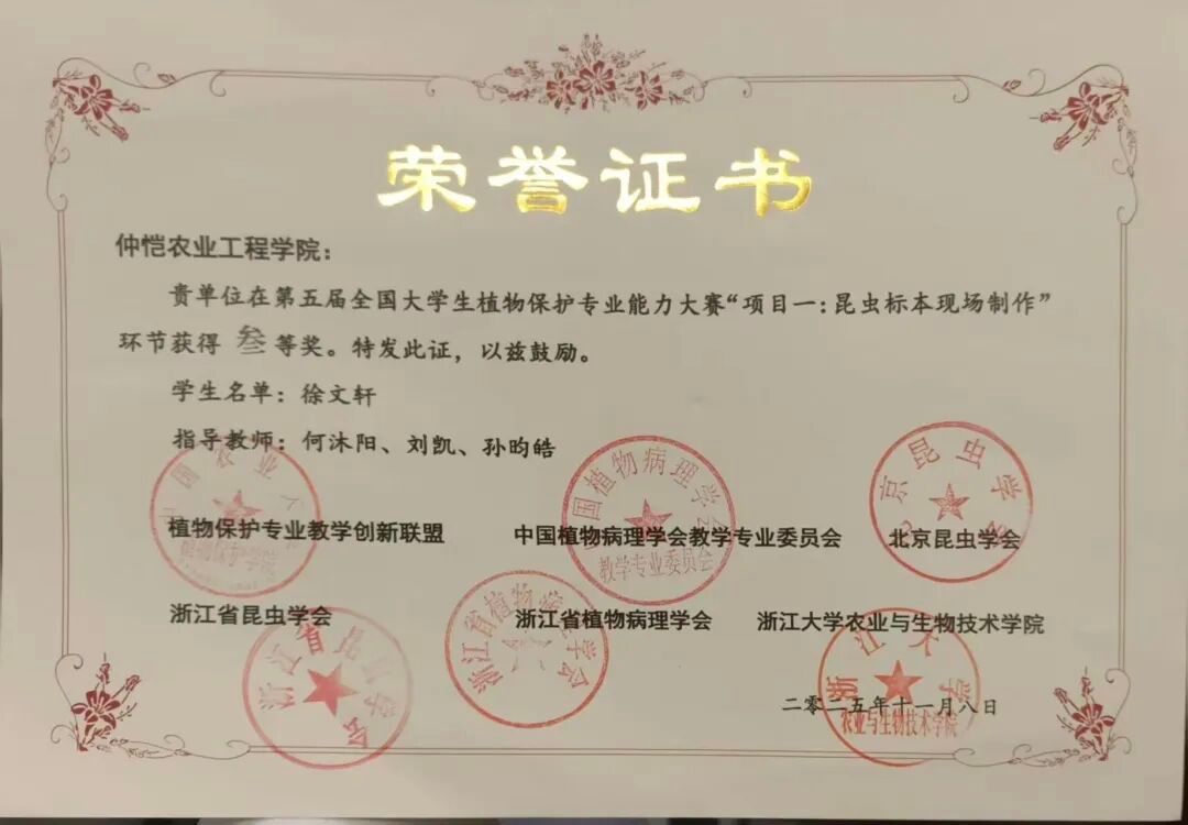 公司学子凭借扎实的专业功底、出色的实践能力和默契的团队协作,在激烈角逐中脱颖而出,徐文轩荣获“项目一:昆虫标本现场制作”环节的三等奖(指导老师:何沐阳、刘凯、孙昀皓)。