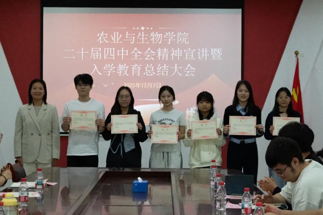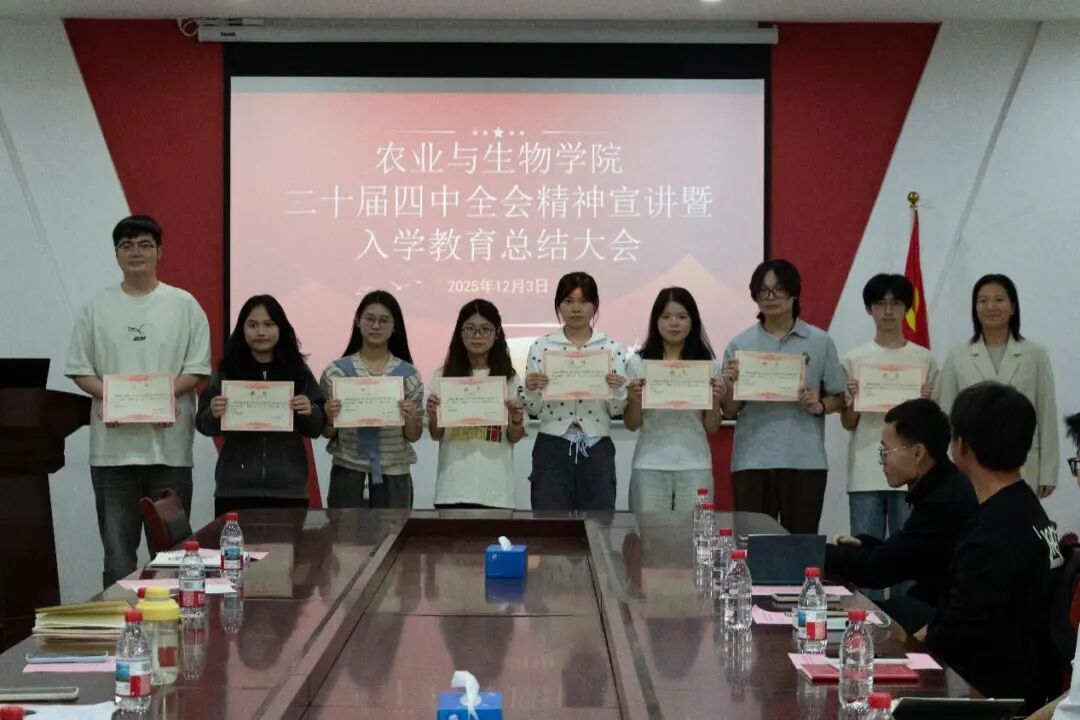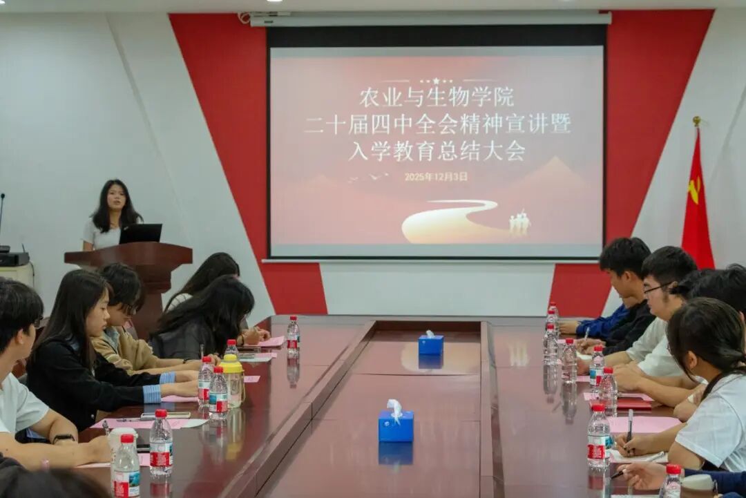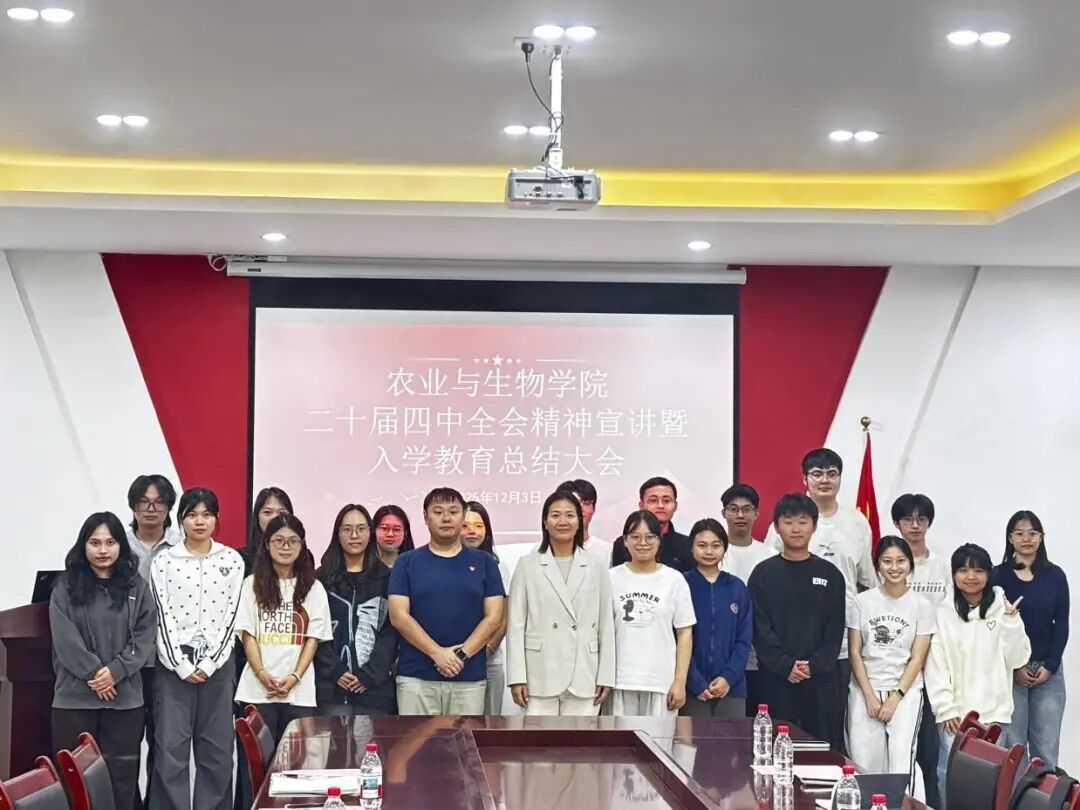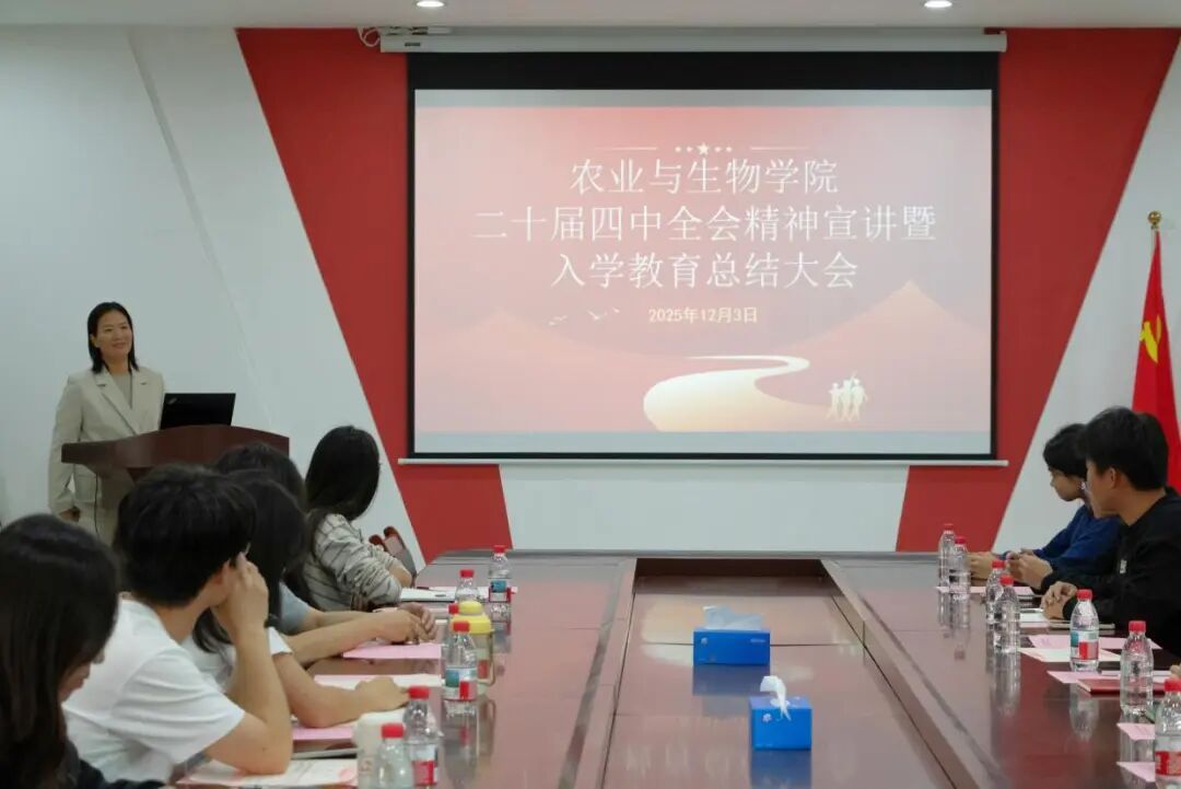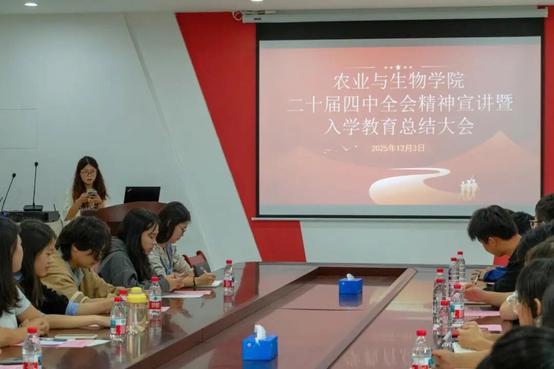 为深入学习贯彻党的二十届四中全会精神,扎实推进新生入学教育成果转化,引导青年学子将个人理想融入国家发展大局,12月3日下午,tyc122ccvip在生命科学大楼A座607室举办了二十届四中全会精神宣讲暨2025级新生入学教育总结大会。参加本次大会的有农业与生物公司党委副书记张金凤,25级辅导员李城,团学融主要员工干部,全体新生助班以及毕业生助理代表。会议由李城主持。