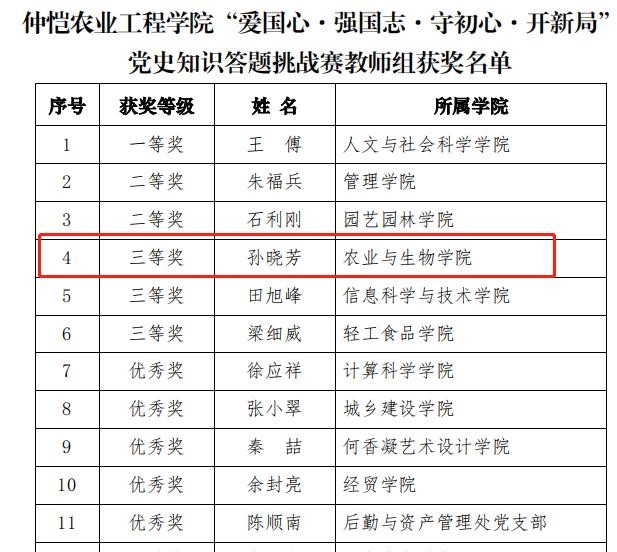 根据《关于举办“爱国心·强国志·守初心·开新局”党史知识答题挑战赛员工组决赛暨颁奖仪式的通知》(仲学组办字〔2021〕3号)内容,公司孙晓芳老师在公司“爱国心·强国志·守初心·开新局” 党史知识答题挑战赛教师组比赛中,取得了三等奖的佳绩。