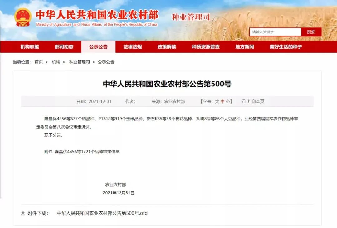 2021年12月31日,中华人民共和国农业农村部发布结果公告第500号。公司作物研究所申请的甜玉米“仲鲜甜102”符合国家玉米品种审定标准,经第四届国家农作物品种审定委员会第八次会议审定通过 ,证书编号:国审玉20210122 ,予以公告。这是一种莫大的荣誉与激励,新的一年,公司将继续发扬积极进取的开拓精神,加大研发力度,培育更多高产优质品种,为国家增产增收,作出更大贡献。