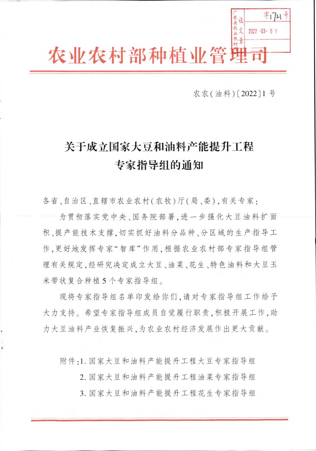 近日,从农业农村部发布的“关于成立国家大豆和油料产能提升工程专家指导组的通知”文件中获悉,公司经理、广东省现代农业产业技术体系花生大豆首席专家郑奕雄教授入选国家大豆和油料产能提升工程花生专家指导组成员,公司当选为国家大豆和油料产能提升工程专家指导组成员单位。