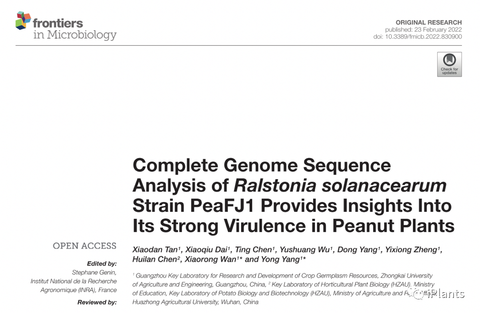 2022年2月,tyc122ccvip、广州市特色作物种质资源研究与利用重点实验室分别在JCR 1区期刊Frontiers in Microbiology和Frontiers in Plant Science发表了题为Complete Genome Sequence Analysis of Ralstonia solanacearum Strain PeaFJ1 Provides Insights into its Strong Virulence in Peanut Plants和Transcriptome Analysis Revealed the Mechanisms Involved in Ultrasonic Seed Treatment-Induced Aluminum Tolerance in Peanut的两篇研究论文。