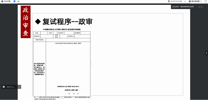 随后,聚创资深考研教师明月对复试流程、考核内容、面试技巧及调剂相关要求做了详细的讲解。她对复试调剂流程图以及复试考核内容进行了分类阐述,同时指出复试要密切关注目标院校国家线和院校线,单科线也要达到,并强调了需要在复试前学习报考院校的指定参考书或历年真题。
