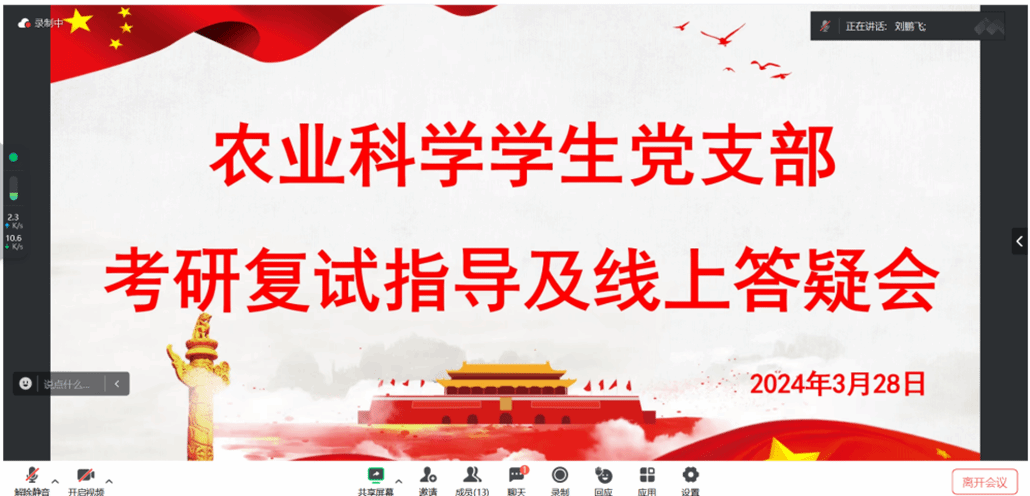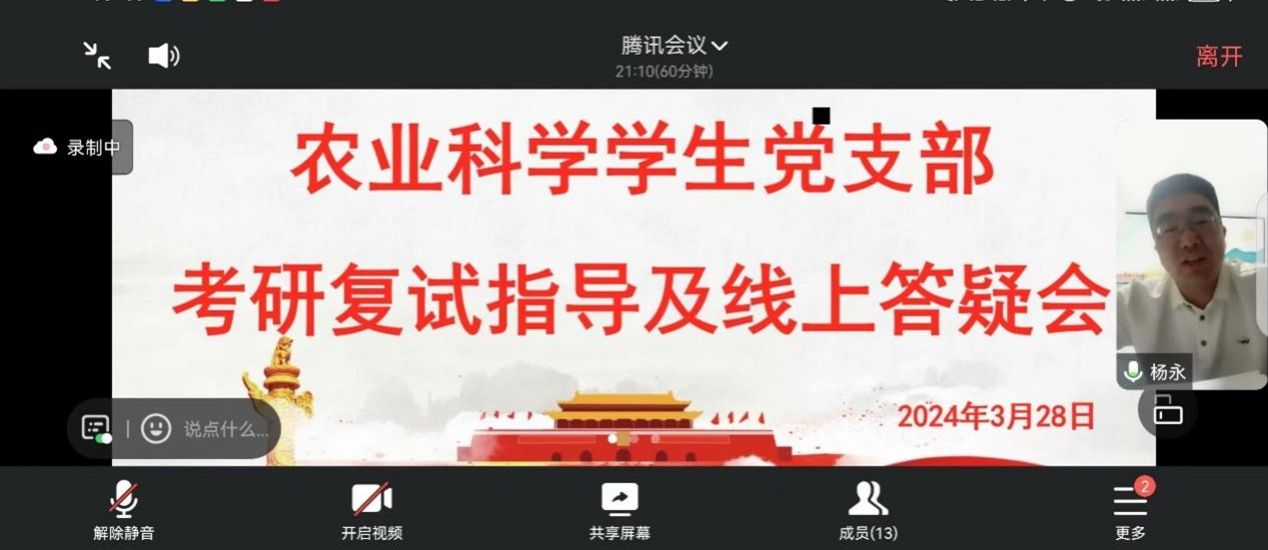 2024年研究生复试在即,为做好本届毕业生考研复试精准指导与服务,同时根据公司党委关于开展《党支部全面结对共建实施方案》的工作要求,加强基层党组织建设,3月28日晚,农业科学教工党支部与农业科学员工党支部结对开展考研复试帮扶活动,并通过召开线上指导及答疑会对即将参与考研复试的员工党员进行“一对一”精准辅导。农业科学教工党支部书记刘鹏飞老师、杨永老师出席,农业科学员工党支部党员参加。此次活动由员工党支部书记邝健睿主持。