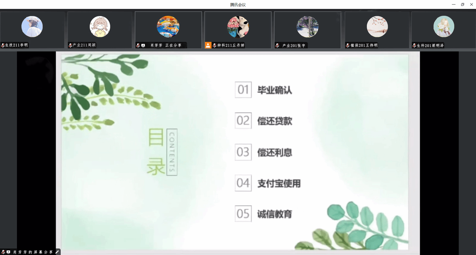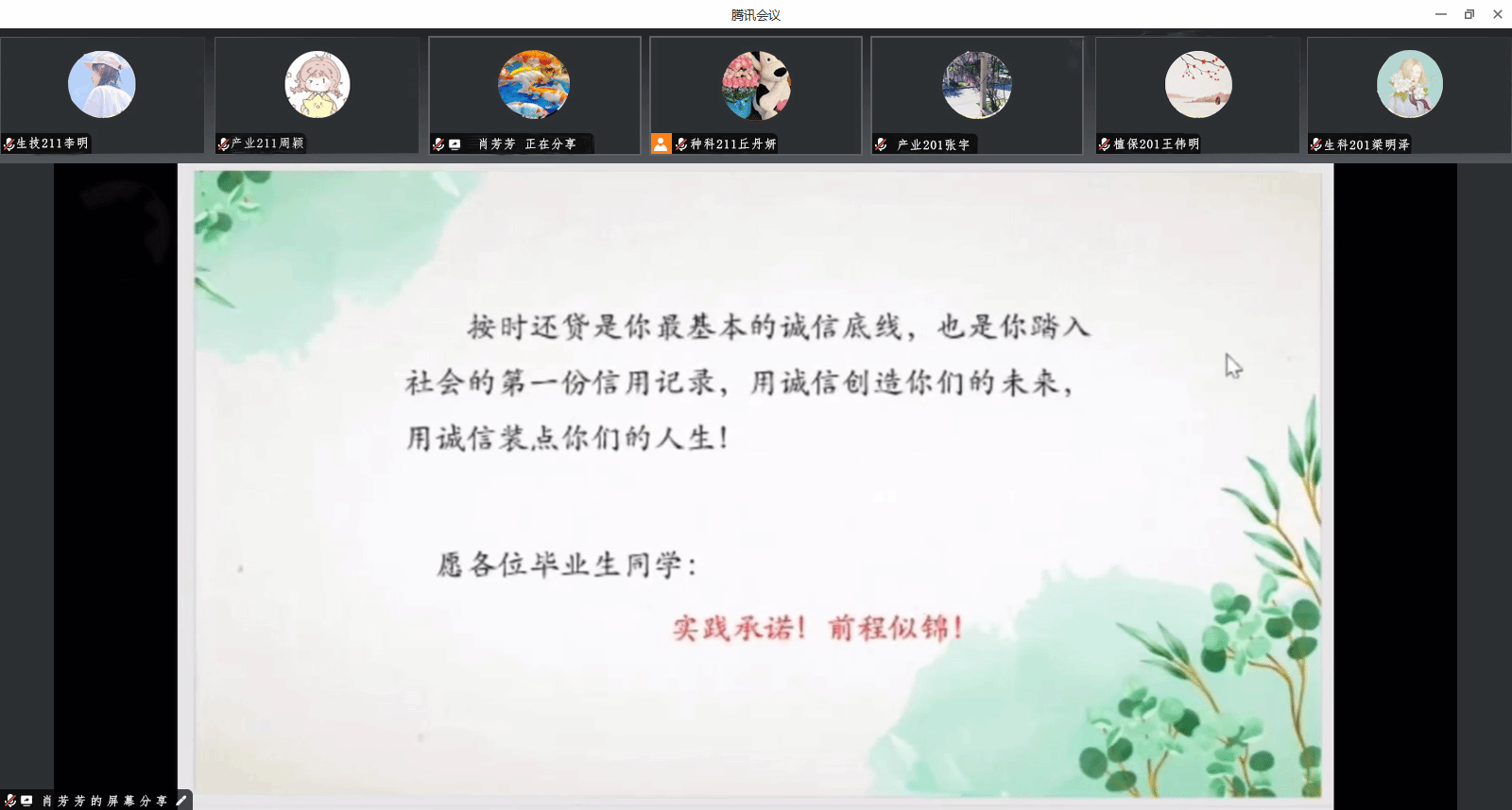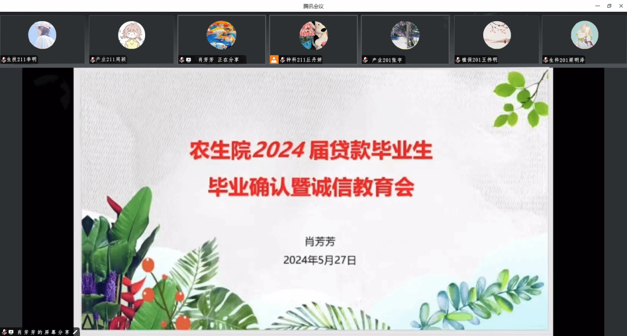 为认真落实国家助学金贷款的相关政策,帮助贷款毕业生了解还款相关程序,提高贷款毕业生诚信还款意识,5月27日下午,tyc122ccvip辅导员肖芳芳组织了关于“2024届贷款毕业生毕业确认暨诚信教育会”的线上主题会议,全体贷款毕业生参加了本次会议。